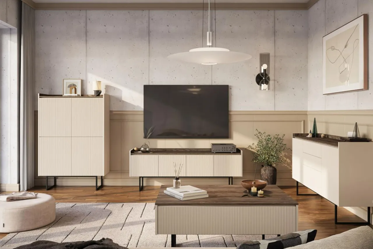 Rozjaśnij wnętrze z kolekcją mebli do salonu LAGO. Ciepły odcień piaskowego beżu sprawi, że pomieszczenie nabierze przytulnego i łagodnego charakteru, sprawiając, że z przyjemnością się w nim zrelaksujesz.
