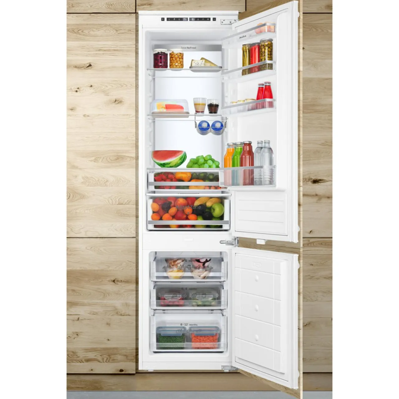 Technologia No Frost zapewnia stałą kontrolę poziomu wilgotności zarówno w chłodziarce, jak i zamrażarce. Oznacza to brak szronu i lodu w środku urządzenia.