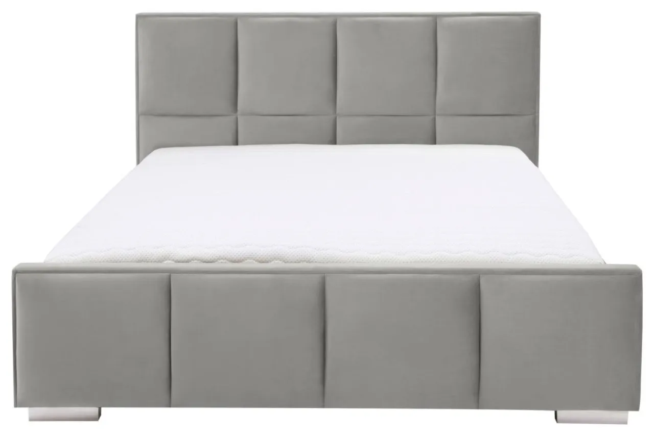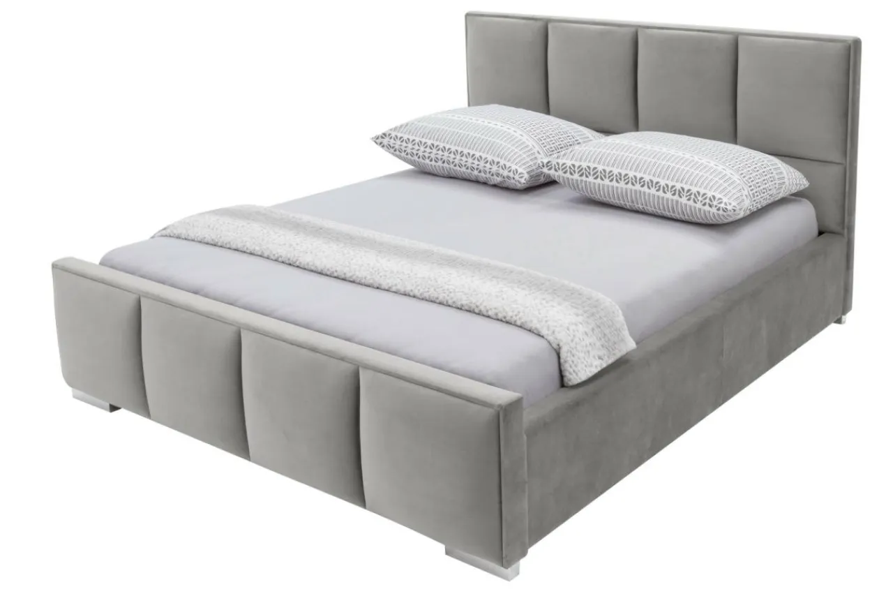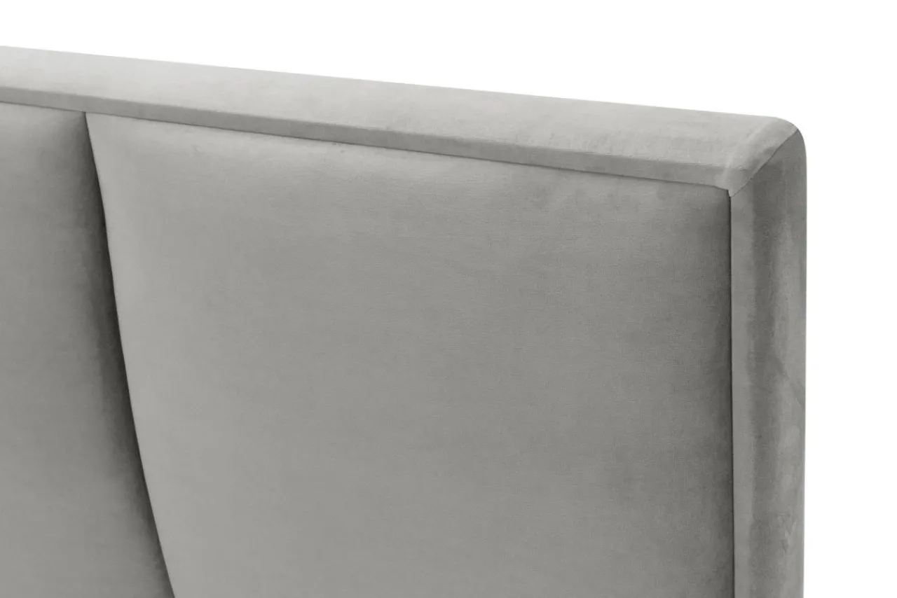 - Łóżko obite jest tkaniną w stalowym kolorze. Welurowa powłoka odbija światło, dzięki czemu odcień zmienia się w zależności od intensywności oświetlenia.