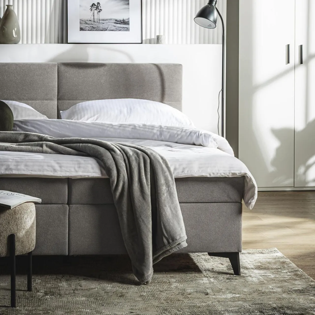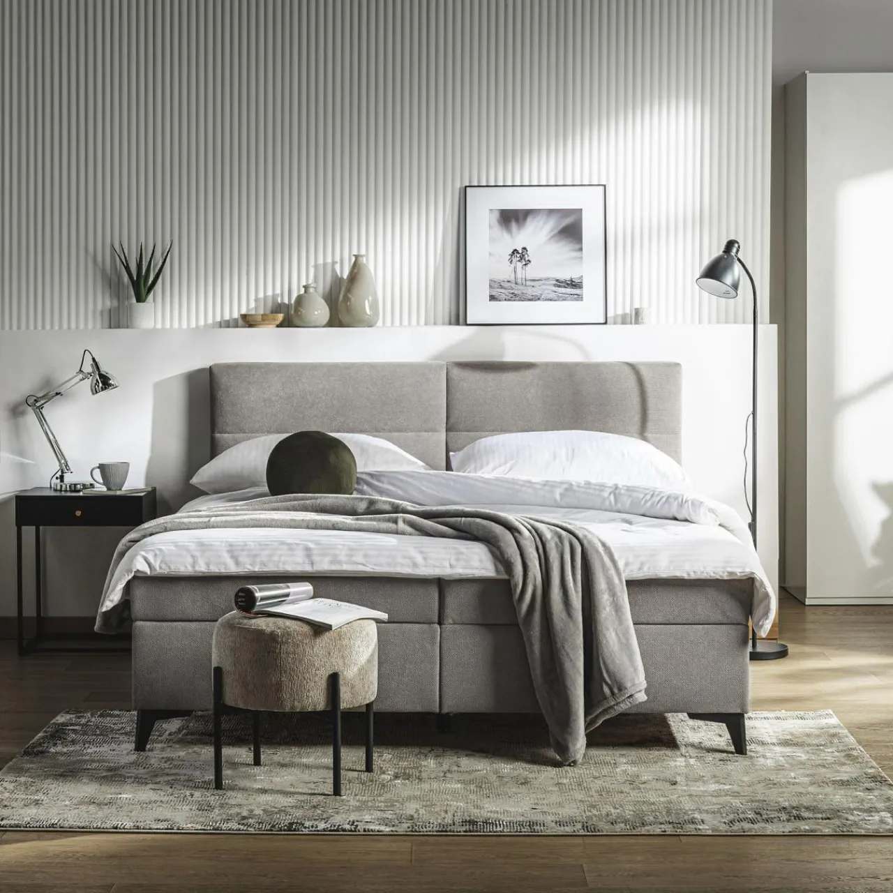 Jasnoszara tkanina, którą pokryto łóżko kontynentalne MARY wprowadzi do wnętrza kojącą atmosferę, która pozwoli Ci na głęboki oddech po zabieganym dniu.