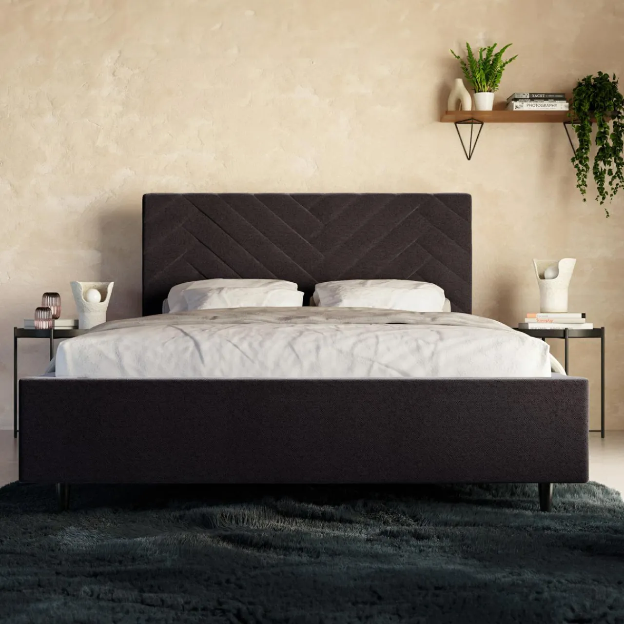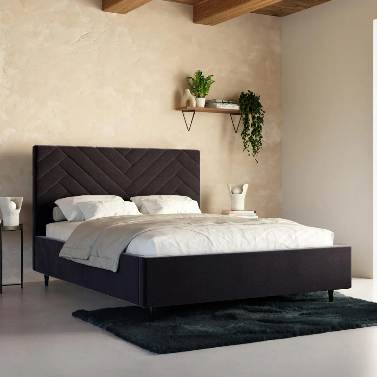 - Łóżko jest wyposażone w tapicerowaną ramę oraz stelaż, które stworzą komfortową powierzchnię spania dla 2 osób.