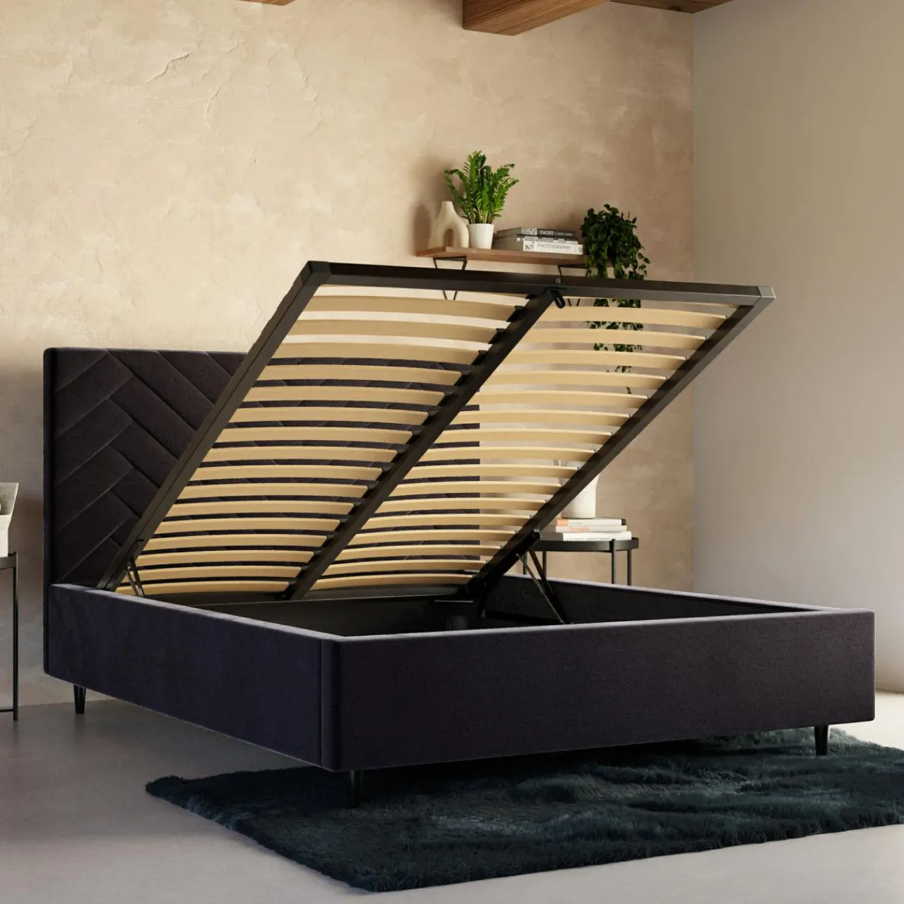 - Pojemnik pod stelażem da Ci przestrzeń, w której przechowasz pościel i inne domowe tekstylia. Dostęp do niego ułatwi Ci podnośnik gazowy.
