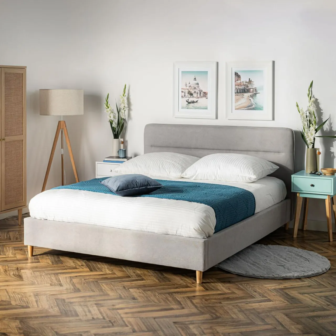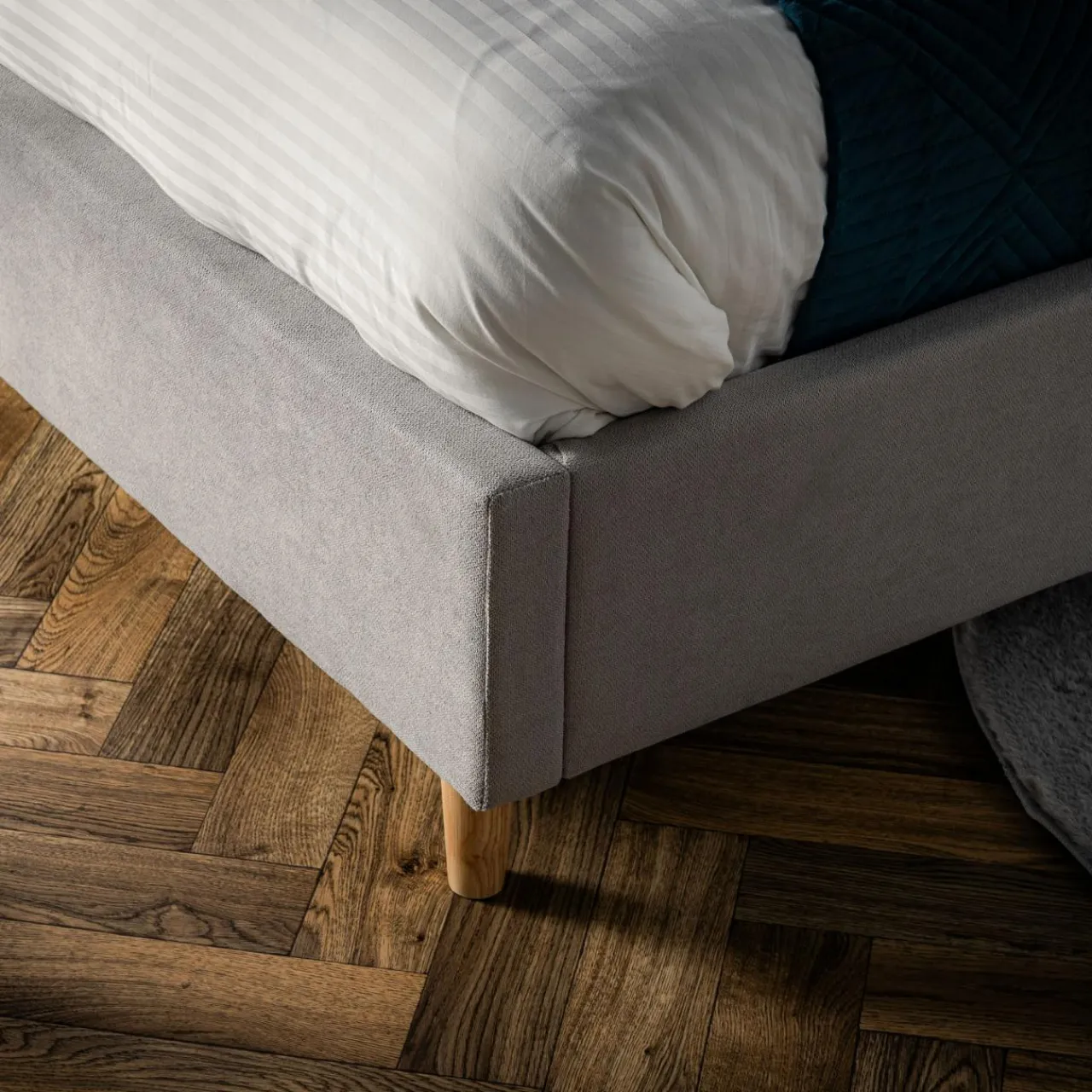 Rama i wezgłowie łóżka w całości obite jest szarą tkaniną.