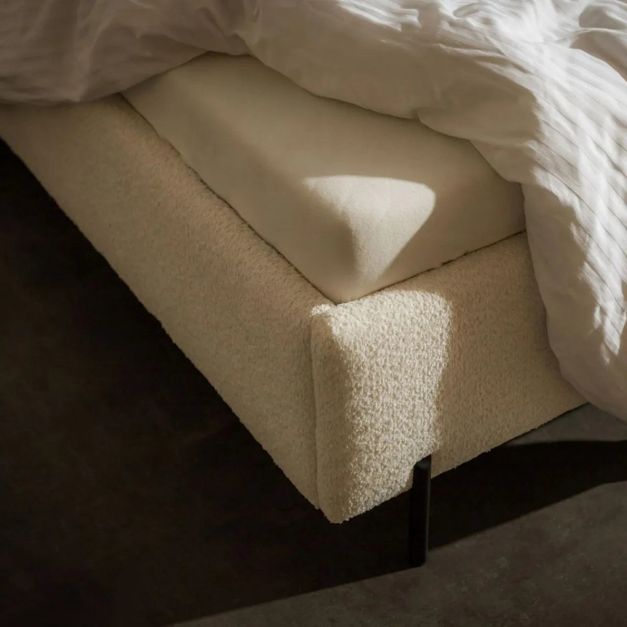 Miękka tkanina łóżka FERRO sprawia, że w sypialnia staje się przytulnym miejscem. Pętelkowa struktura tkaniny boucle jest jak ciepły sweterek, którym otulasz się w zimowe wieczory. W takim otoczeniu łatwiej się zrelaksować i zasnąć.