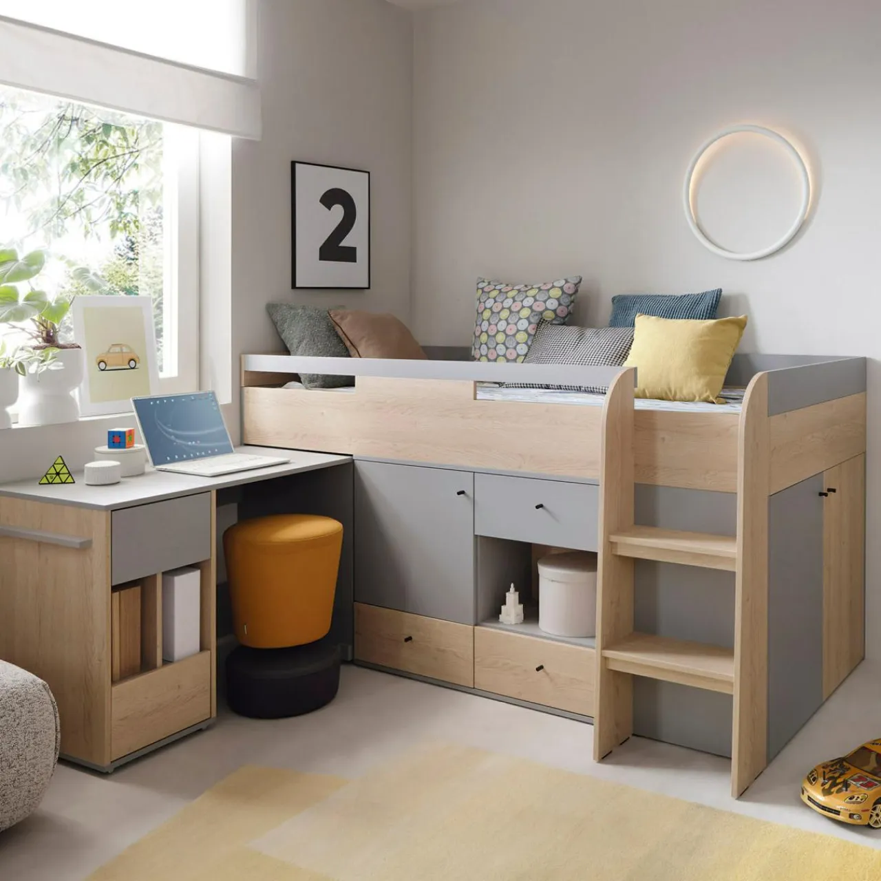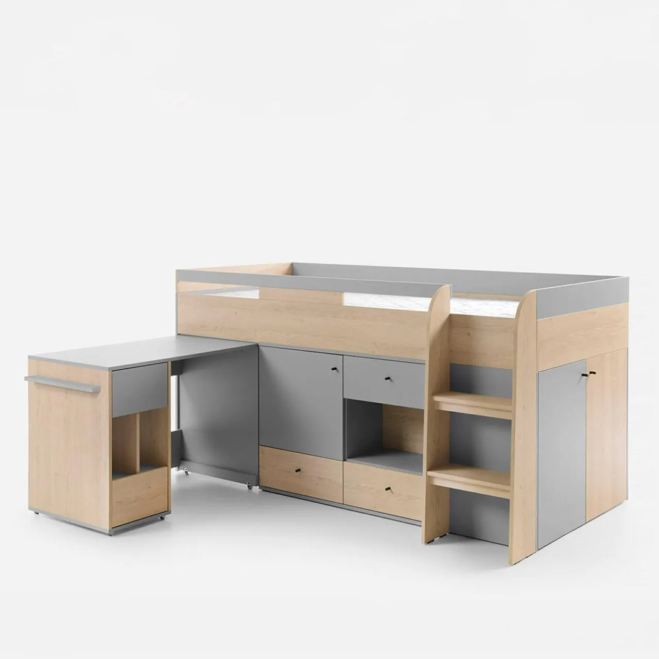 Łóżko ORO to coś więcej niż miejsce do spania. W swojej zabudowie posiada biurko oraz półki, szafki i szuflady, które zaoszczędzą przestrzeń w mniejszych pokojach.