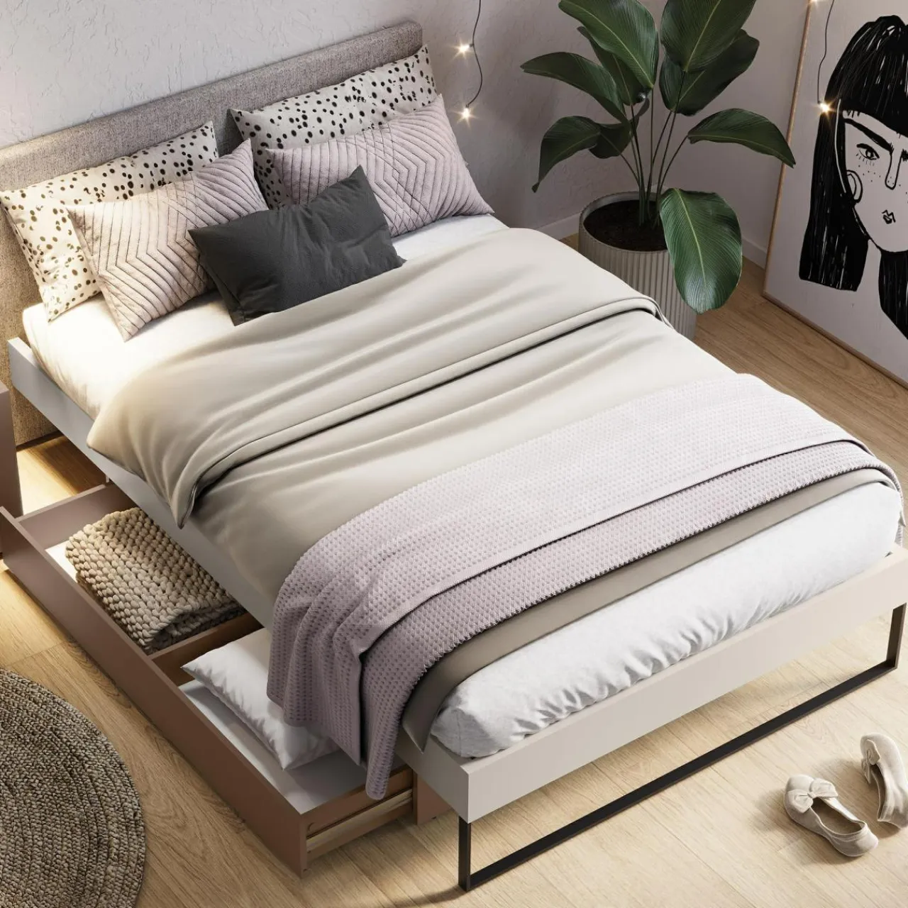 - W pojemnej dzielonej szufladzie schowasz zapasową pościel, kołdry czy koce.