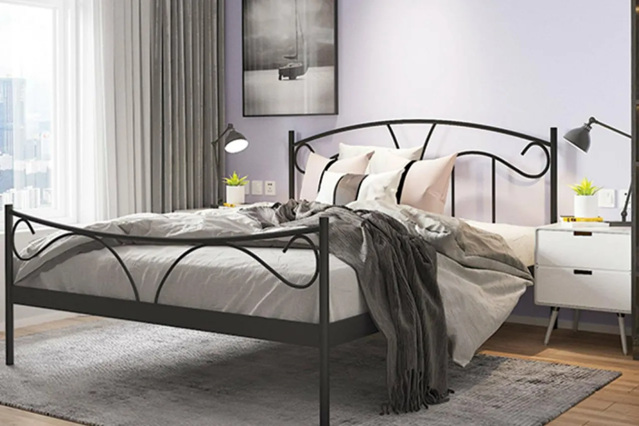 Łóżko ma industrialną, metalową konstrukcję w czarnym kolorze, oraz matowym odcieniu,