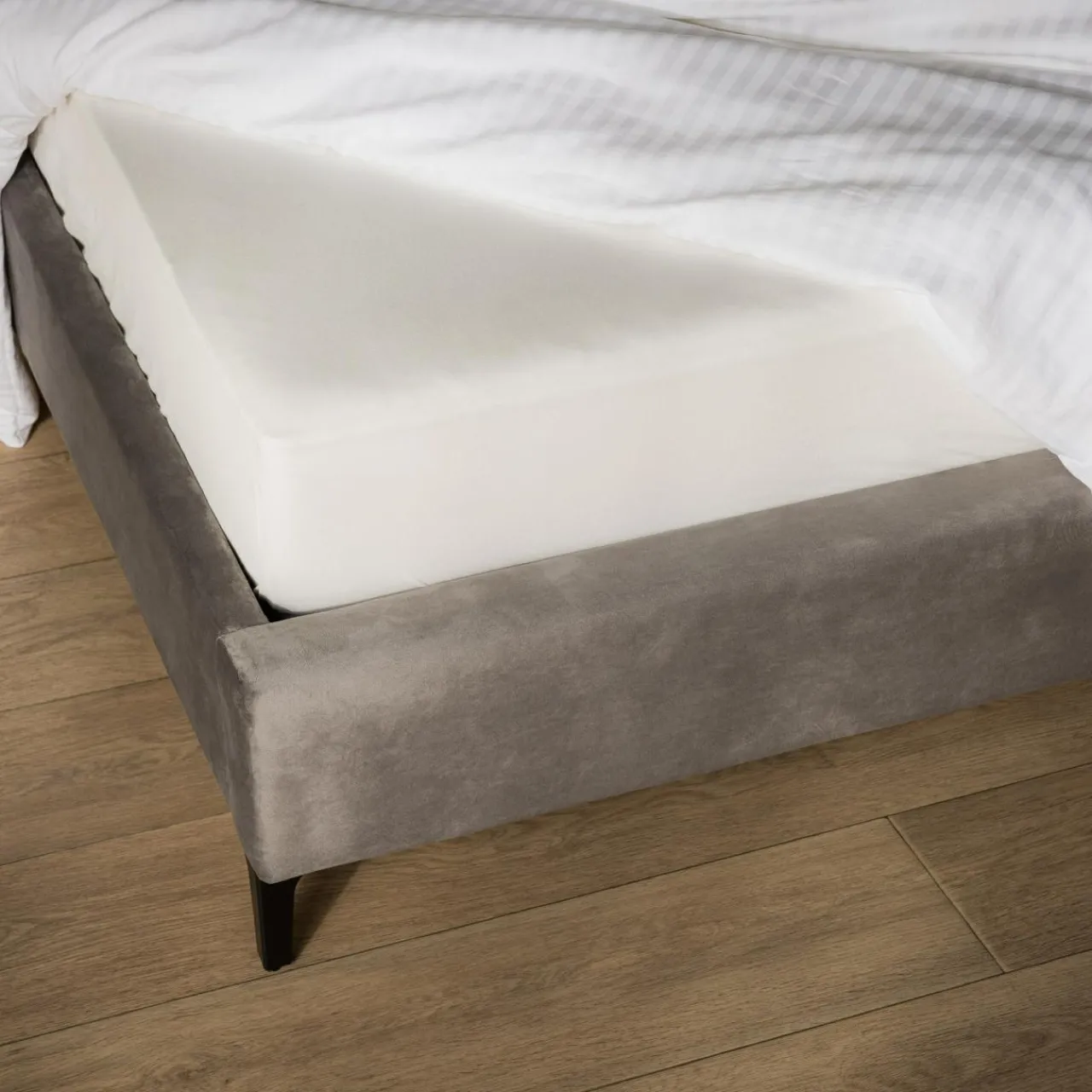 - Obicie zostało wykonane z miękkiego weluru w szarym kolorze.