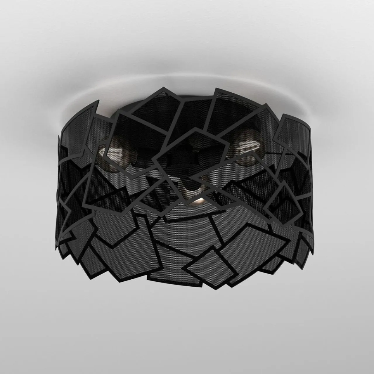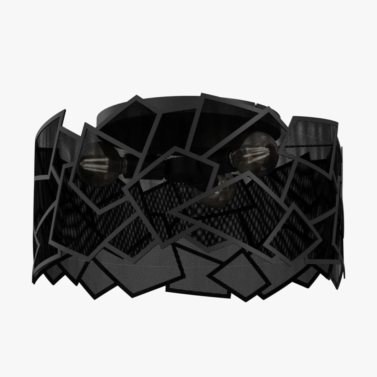 - Metalowy abażur sufitowej lampy CAMO zwraca uwagę ciekawym wzorem – siateczka w czarnym kolorze wpisana w ostro zakończone geometryczne figury. Nachodzące na siebie kształty dyskretnie przysłaniają żarówki.
