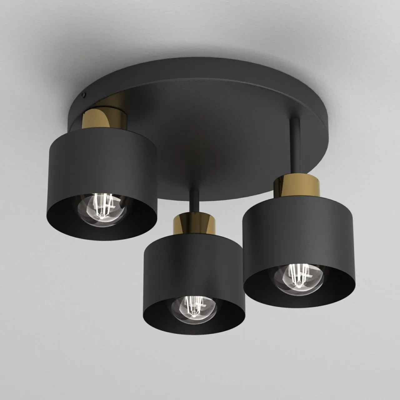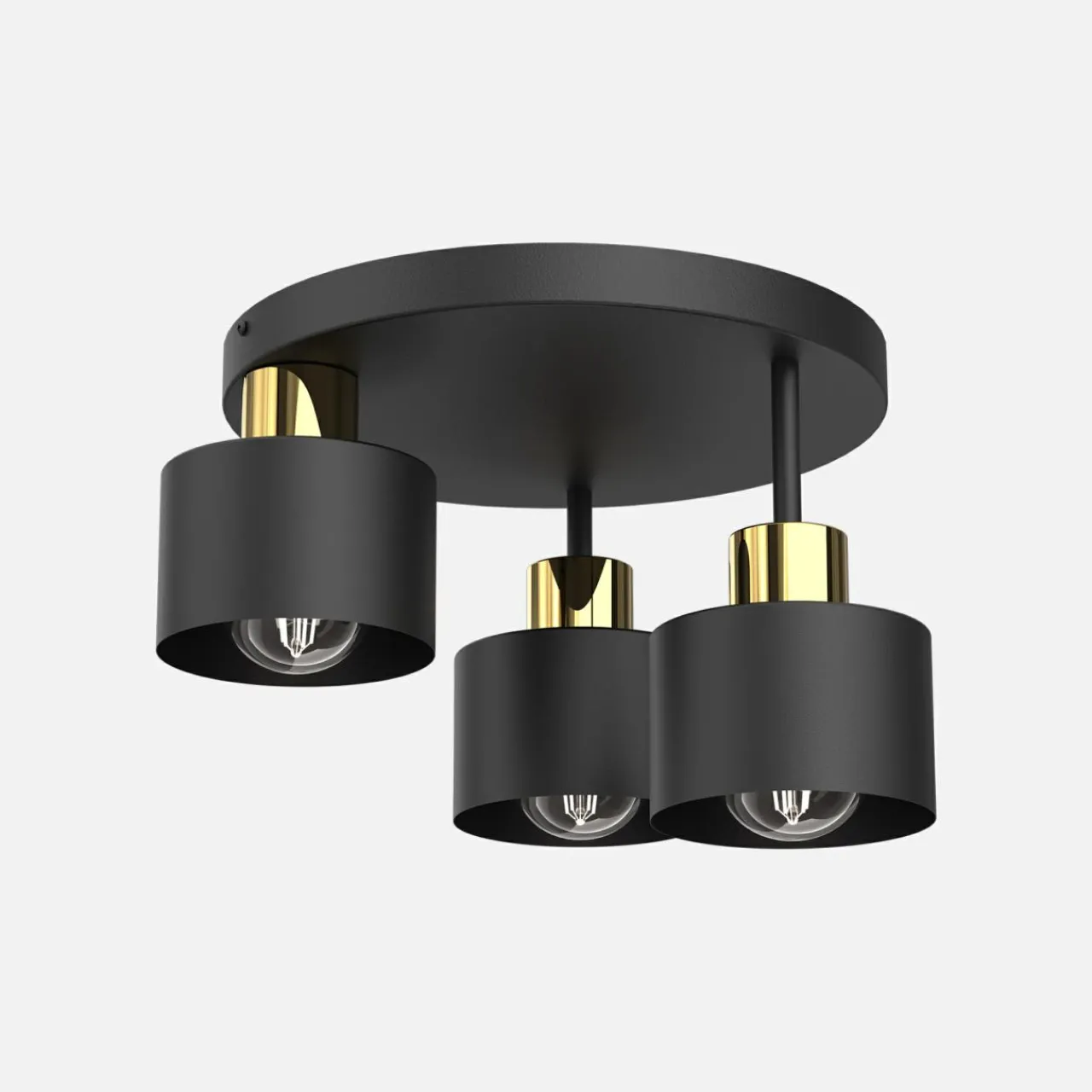 Na uwagę zasługują pełne klosze o kształcie walców, które podkreślają geometryczny design lampy. Zarówno okrągła podsufitka lampy, jak i klosze zostały wykonane z metalu wykończonego czarnym kolorem.