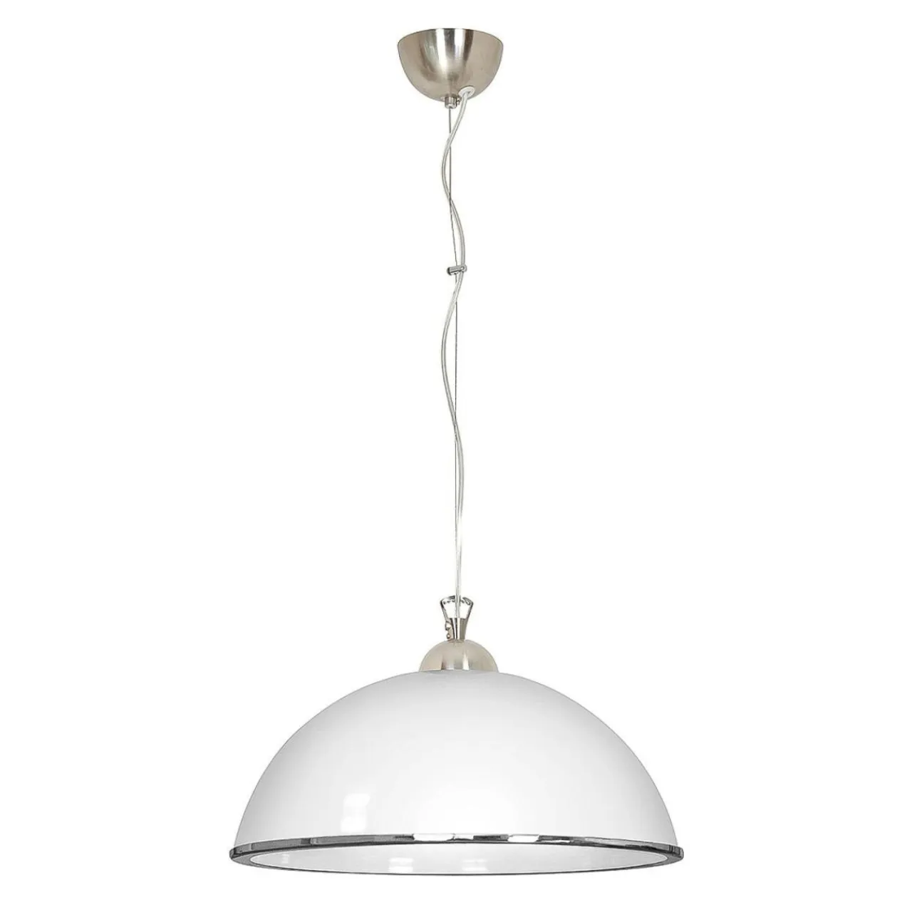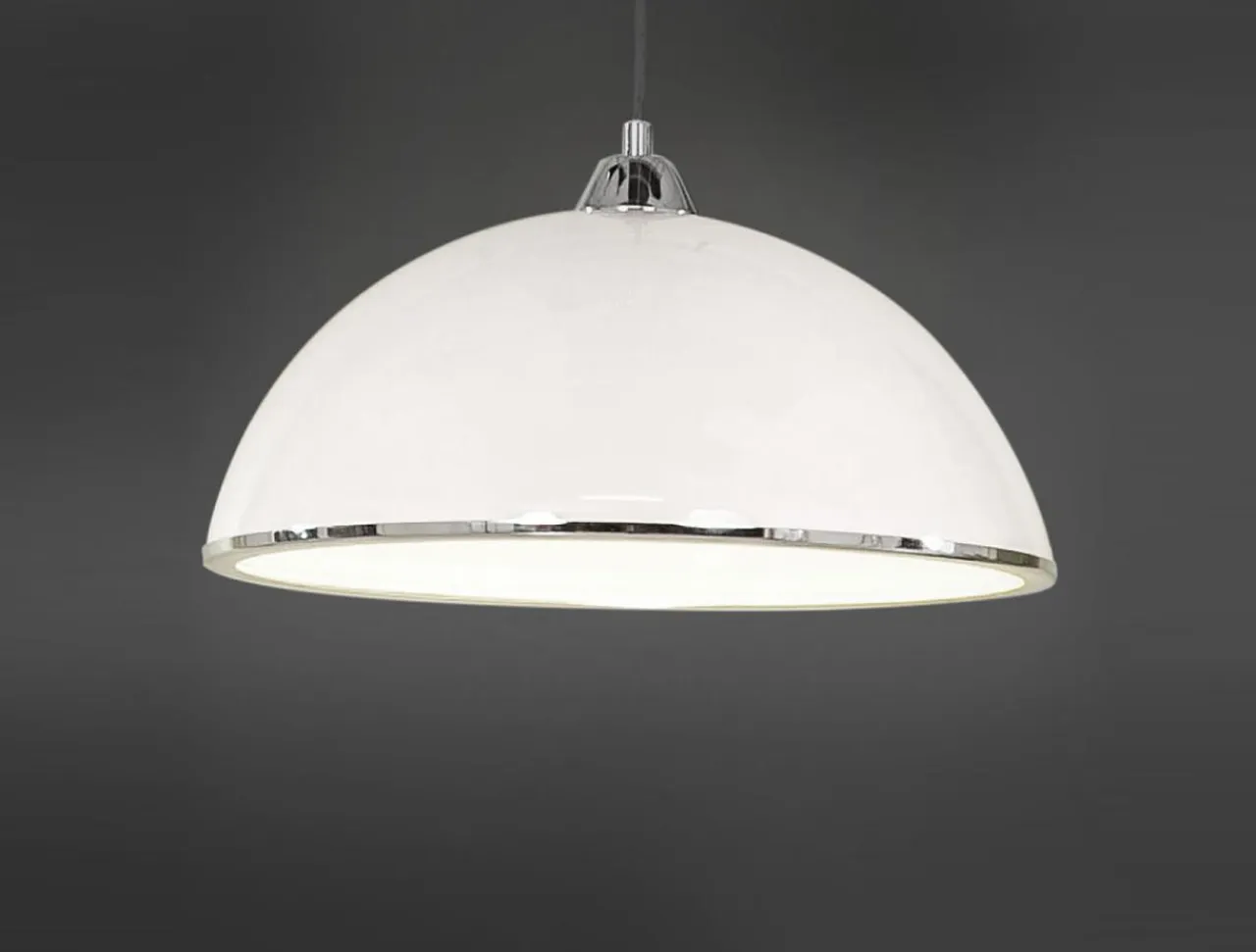 Biały kolor klosza ozdobiony chromowanymi wykroczeniami przy krawędziach oraz zwieńczeniu świetnie łączy się z jasną kolorystyką ścian oraz mebli.