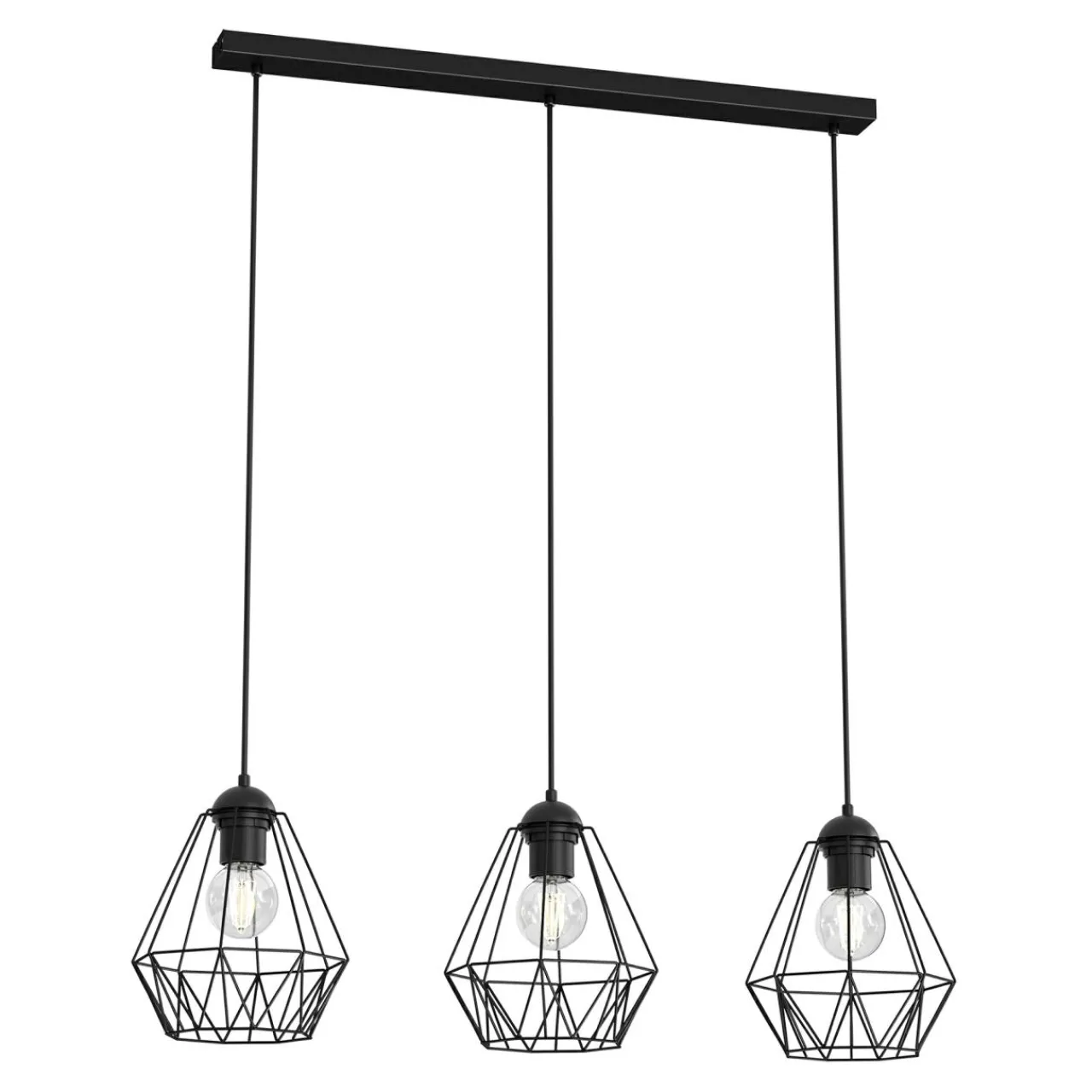 Klosze złożone ze starannie połączonych metalowych elementów tworzą geometryczną konstrukcję, która doskonale prezentuje się w połączeniu z ozdobnymi żarówkami o standardowej wielkości. Ich zamontowanie doskonale podkreśla walory pomieszczenia i nadając wnętrzu ciekawy wizualnie efekt załamywania światła. Podstawa lampy – montowana do sufitu listwa – wykonana została z metalu wykończonego czarnym kolorem.
