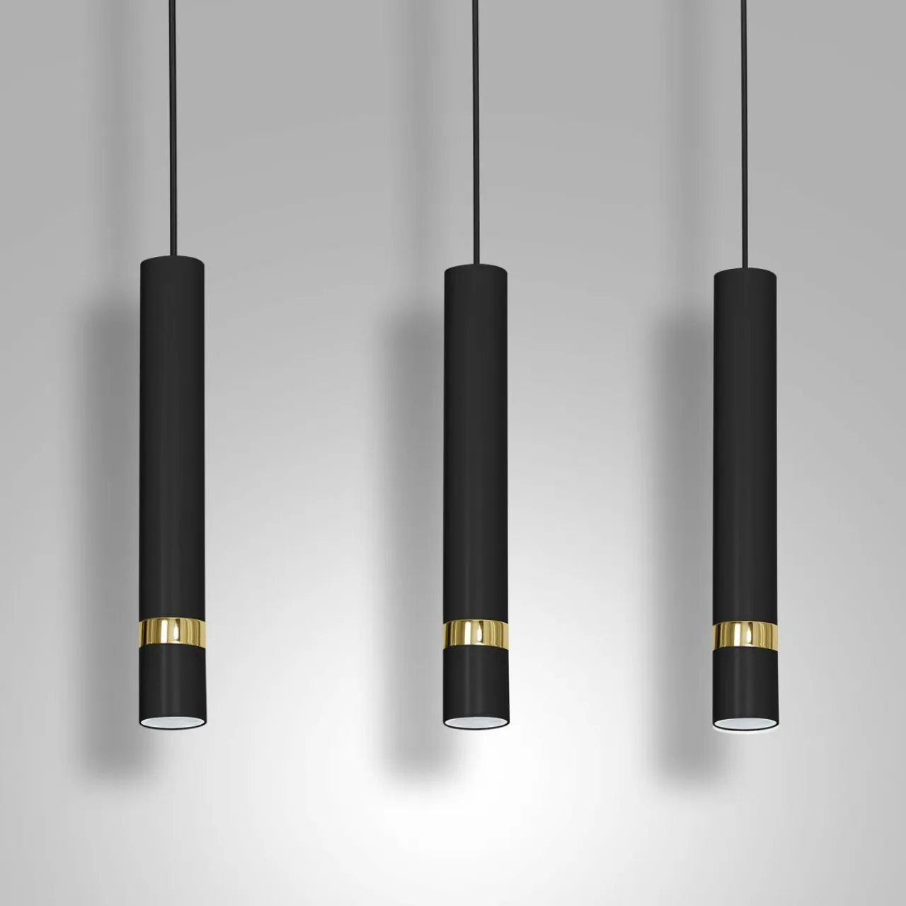 - Obudowa lampy w kształcie listwy z 3 skierowanymi pionowo w dół walcami została wykonana z lakierowanego metalu. Cechą charakterystyczną pierścienie w kolorze złota.