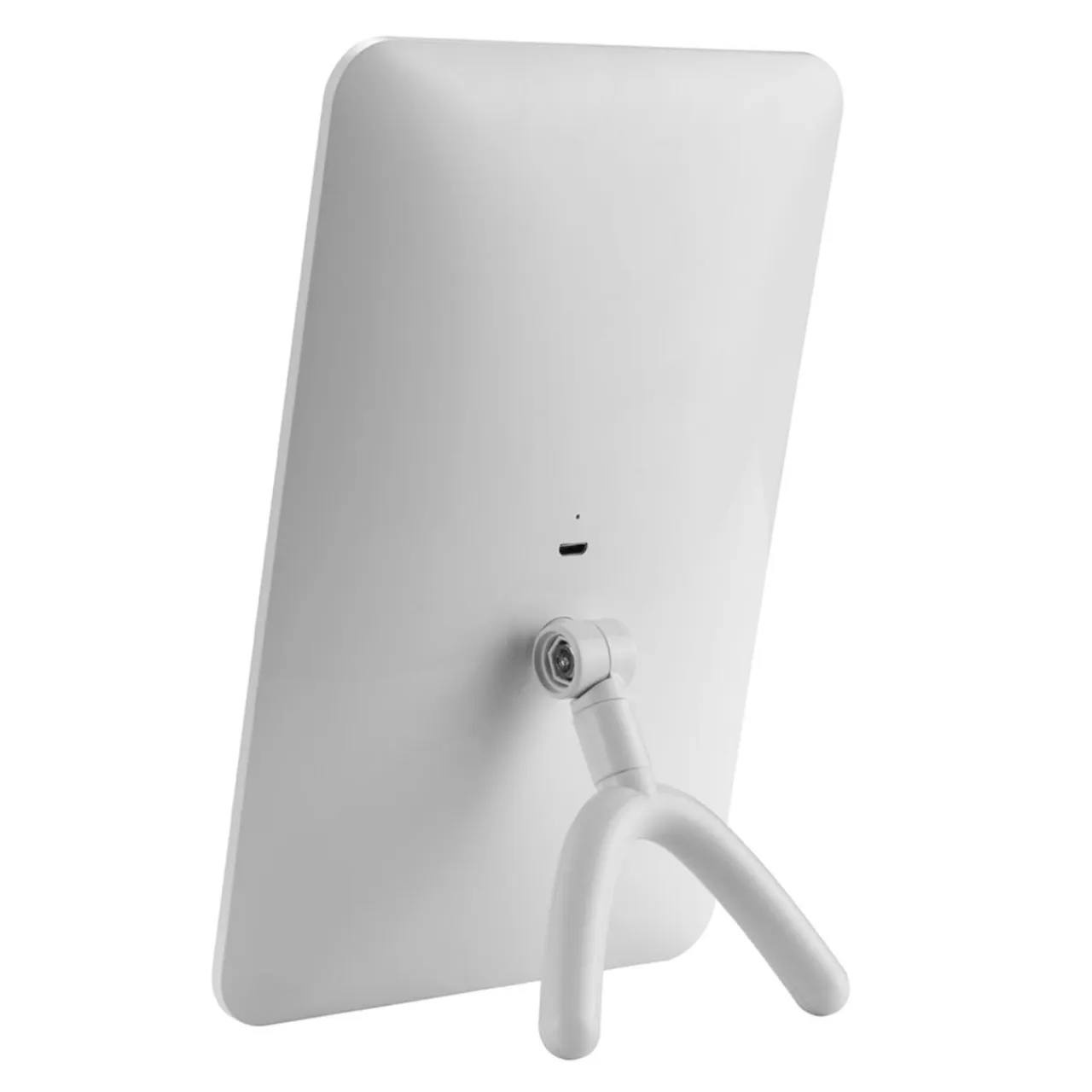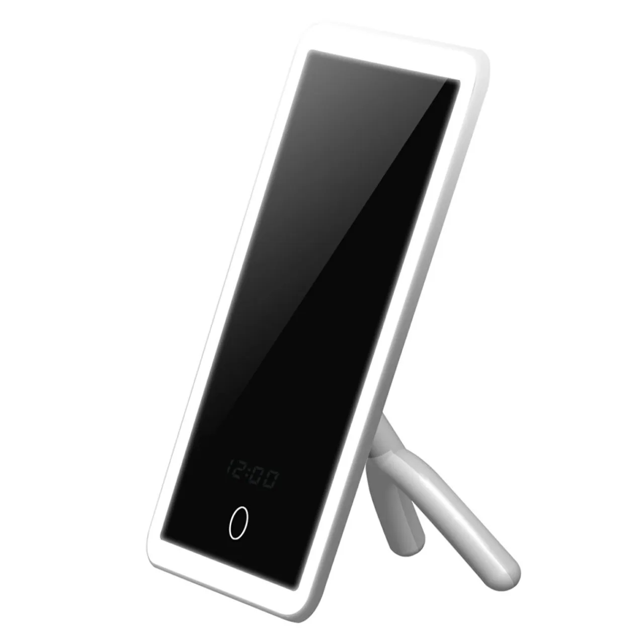 Posiada prostokątny kształt z wysuwaną nóżką, na której możesz je oprzeć. Dookoła tafli lustra znajduje się pasek LED, który po włączeniu generuje światło o mocy 3W i strumieniu świetlnym rzędu 80 lumenów.