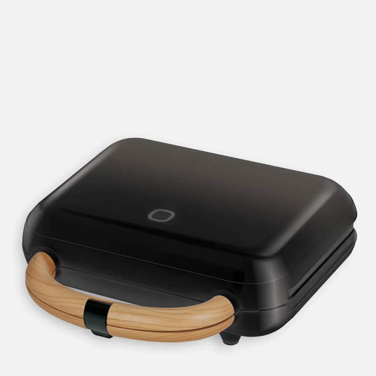 Model opiekacza MOP-51/C został wykończony w czarnym, matowym kolorze z uchwytem ozdobionym o wybarwieniu jasnego drewna.