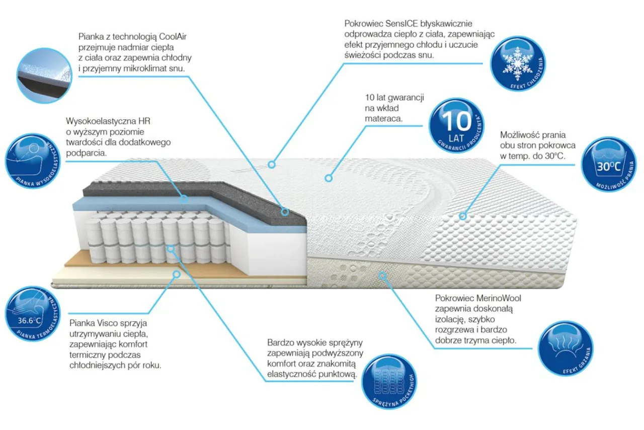 - Strona SensICE odprowadza ciepło z ciała, zapewniając efekt przyjemnego chłodu. Wpływa na jakość snu podczas letnich gorących nocy.
