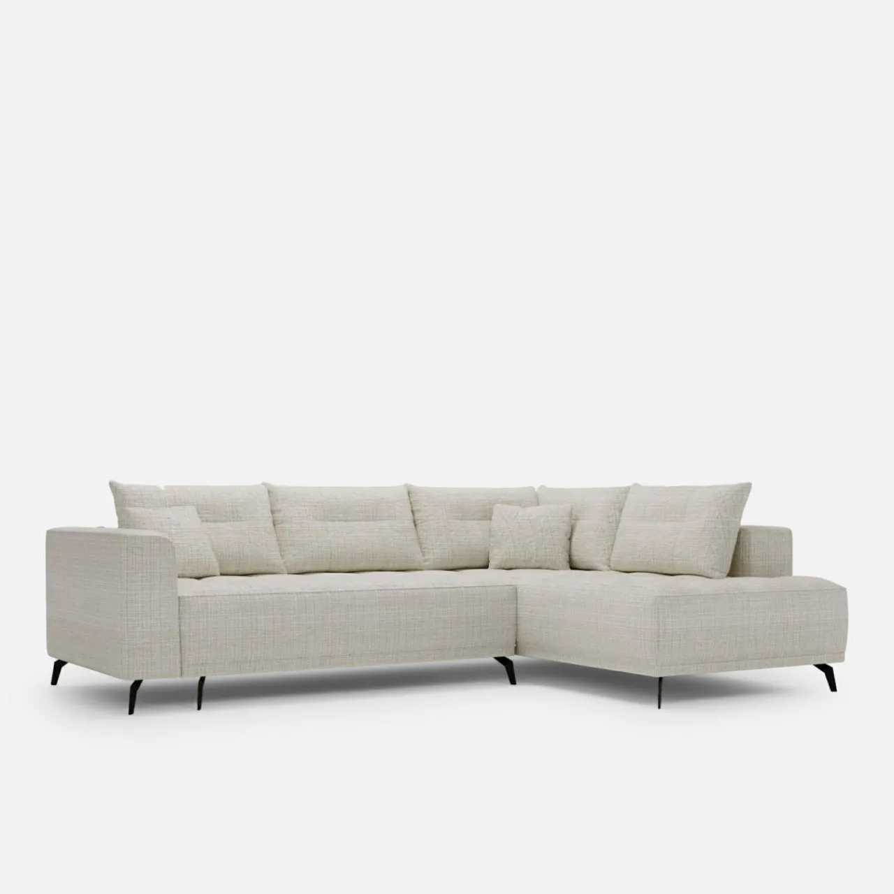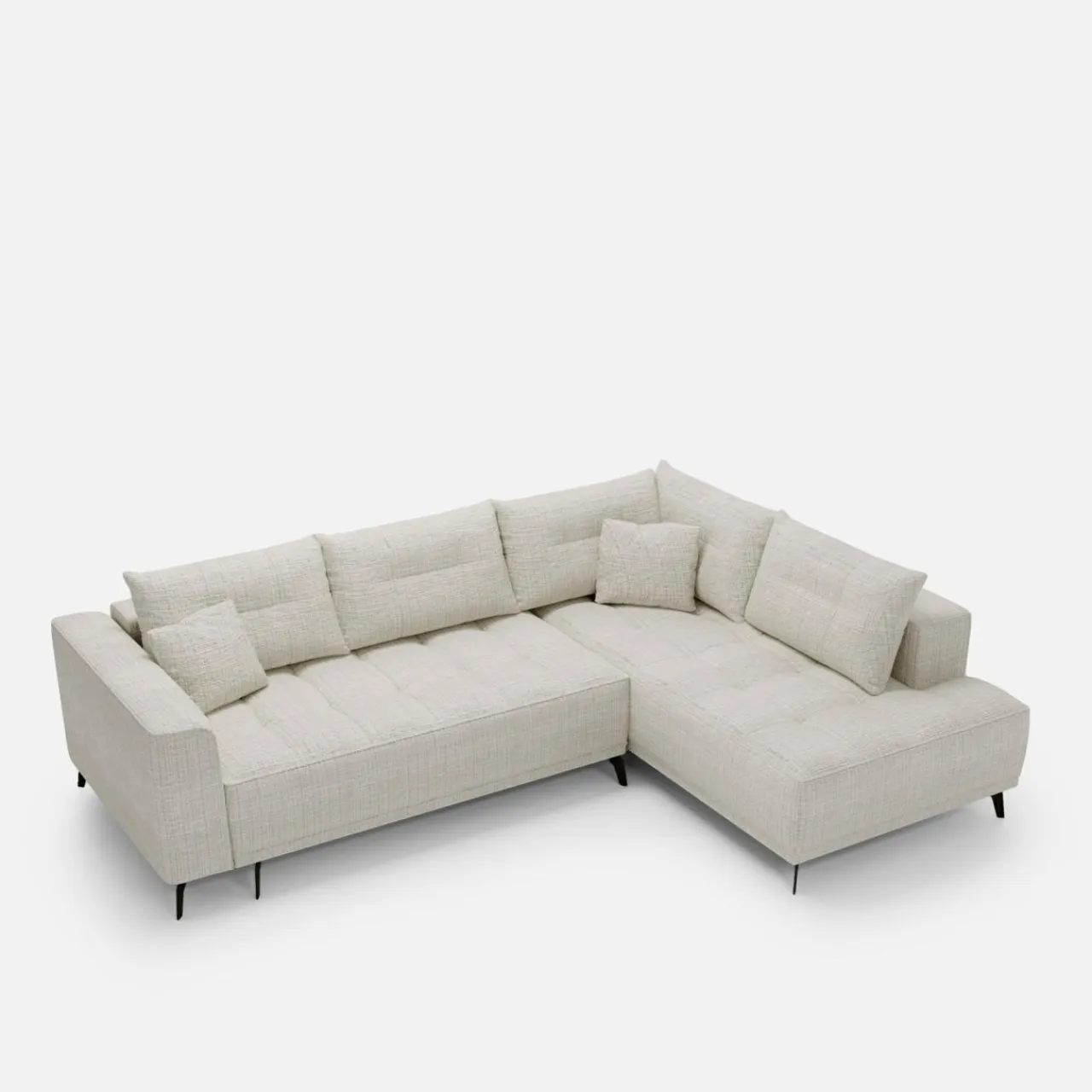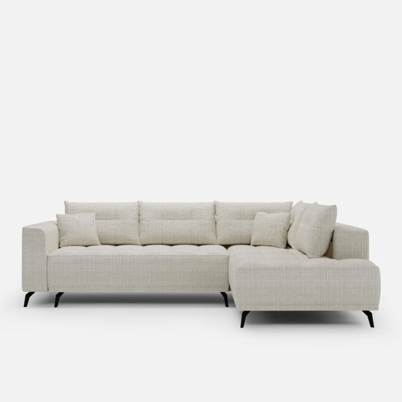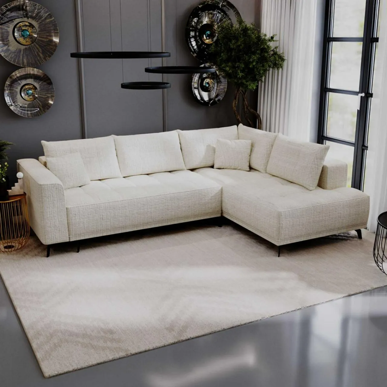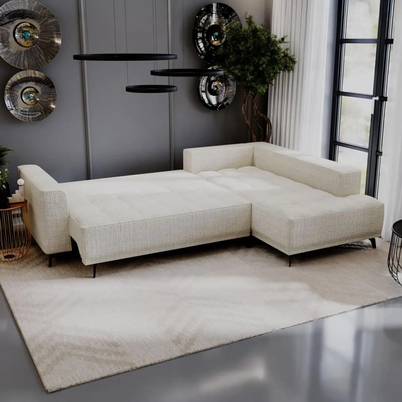 Miękkie poduszki zapewniają wygodę, a pojemnik pod siedziskiem pozwala schować pościel. Mechanizm DL ułatwia szybkie rozłożenie narożnika na dodatkowe miejsce do spania.