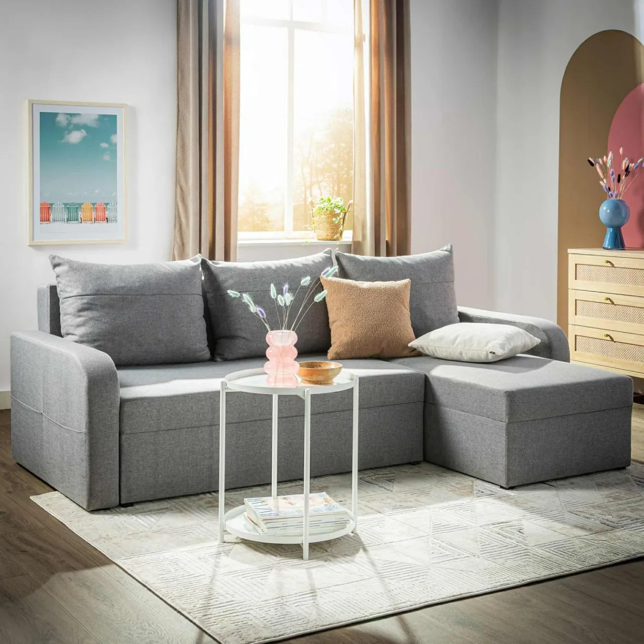 Dodatkowo boki narożnika posiadają wszyte kieszonki, które pozwolą na szybkie schowanie drobiazgów pokroju gazety, czy krzyżówki.