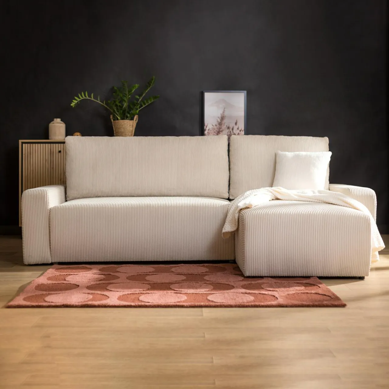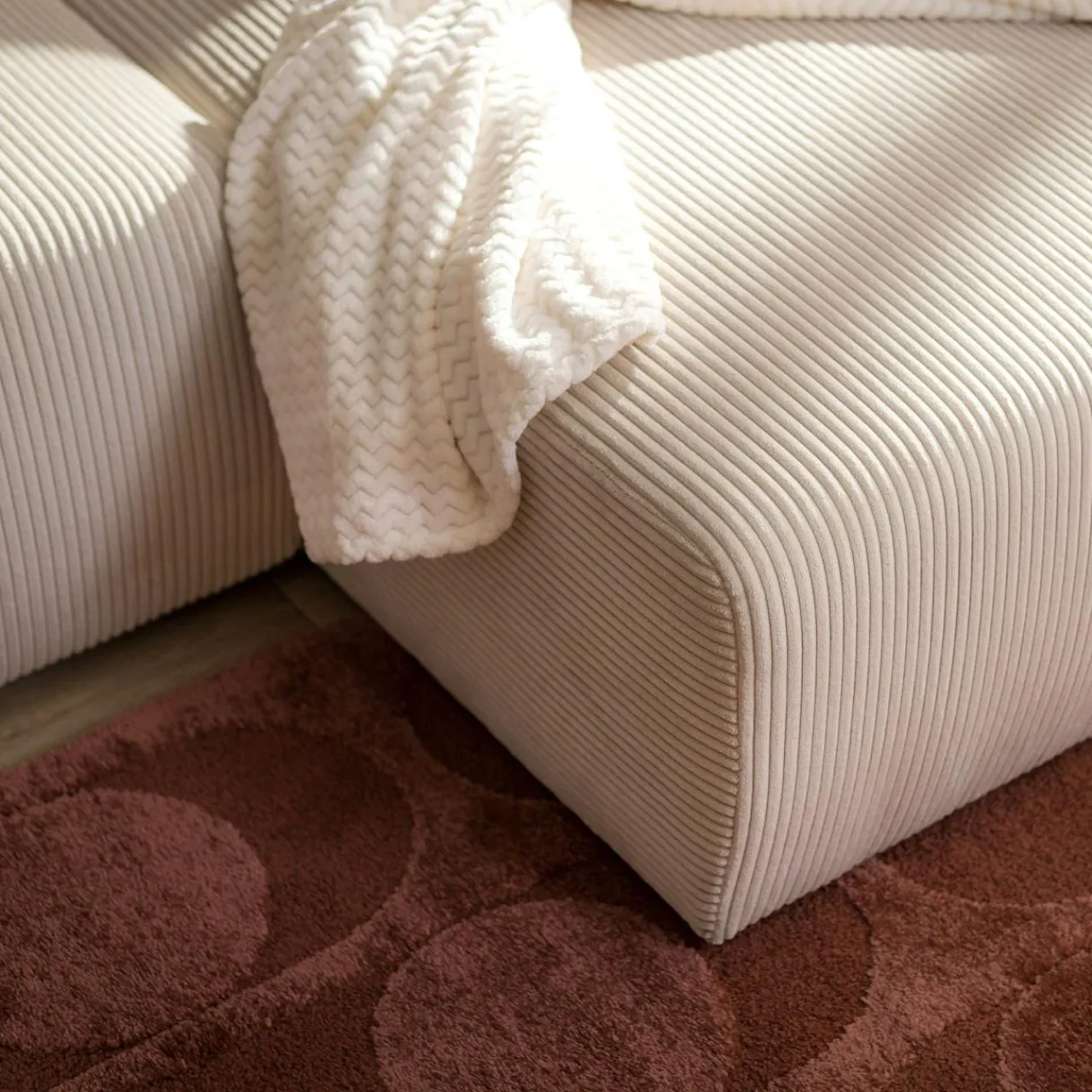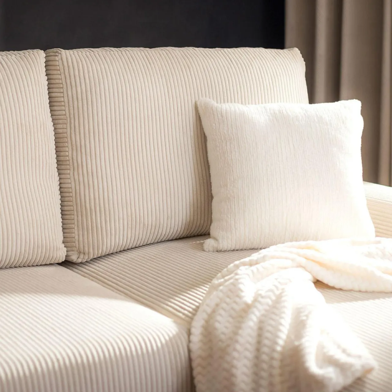 - Narożnik w kolorze kremowym świetnie sprawdzi się we wnętrzach urządzonych w stylu boho lub skandynawskim.