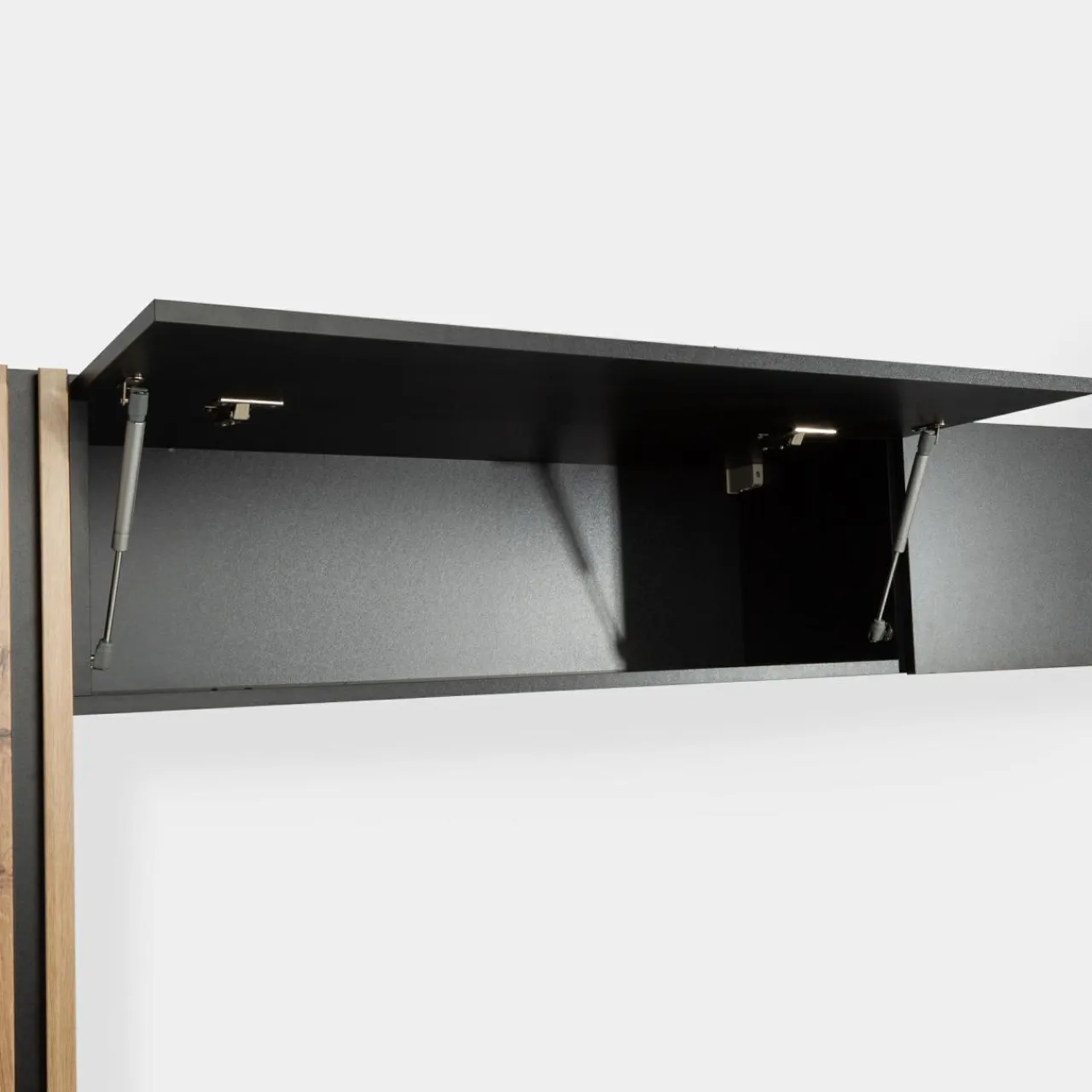 - Górne szafki klapowe wykorzystaj na lekkie przedmioty. Może również służyć jako miejsce na słodkie i słone skarby, po które chętnie sięgniesz podczas oglądania ulubionego serialu.