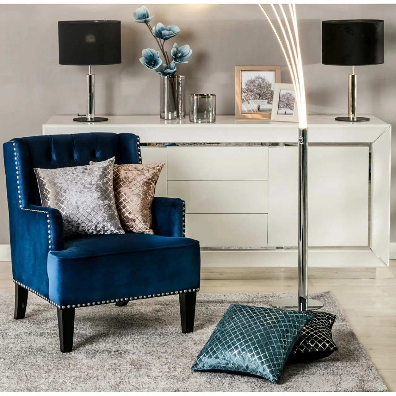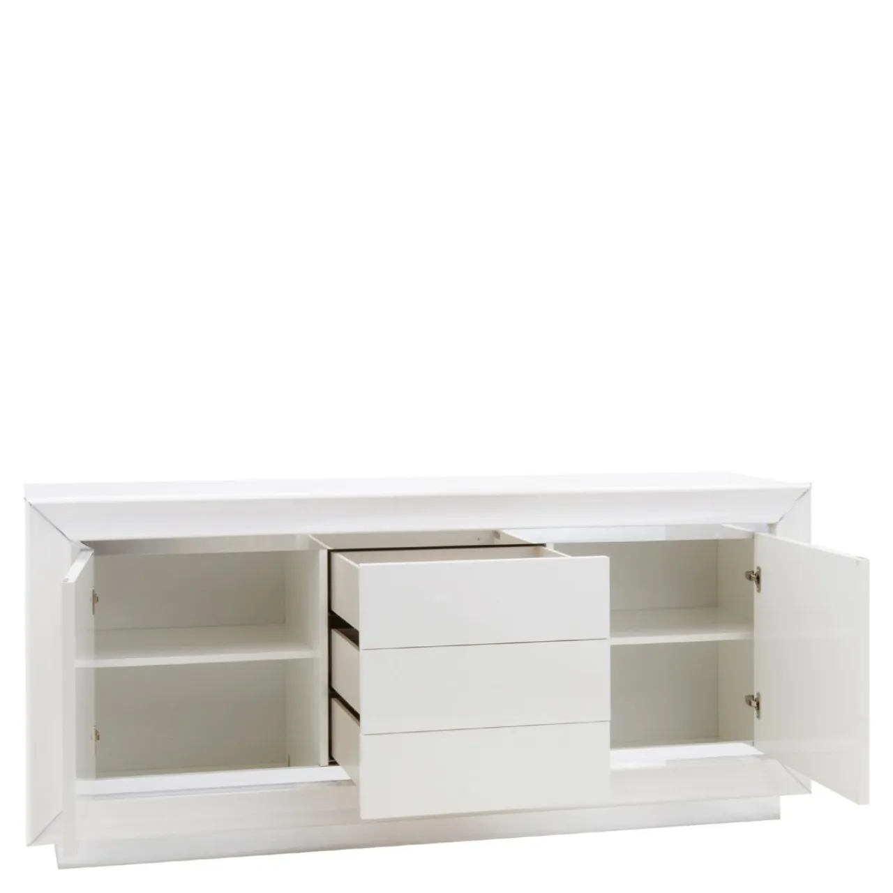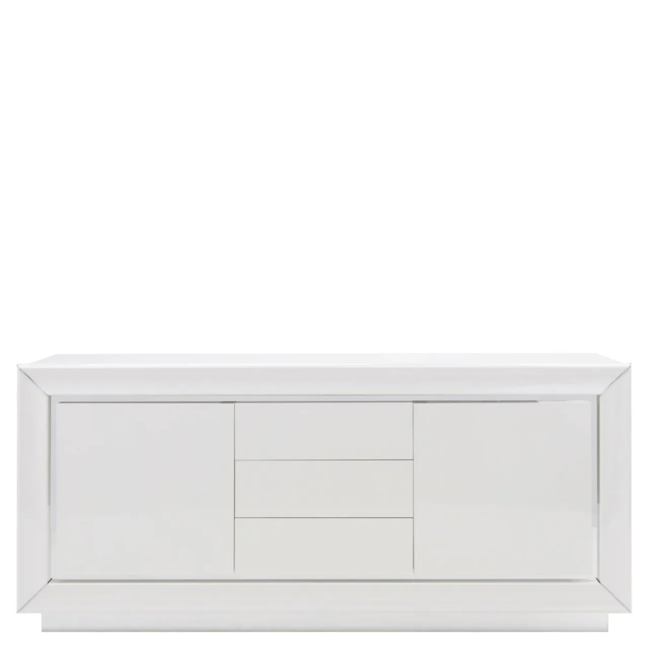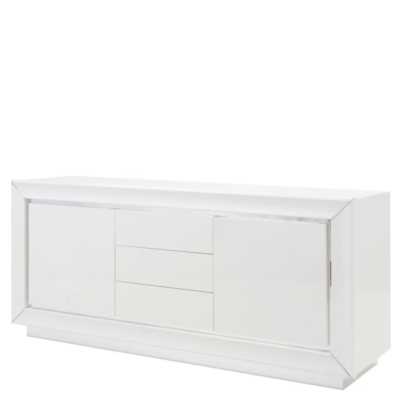 Biała, budząca skojarzenia z luksusem barwa pokrywająca bufet, harmonizuje błyszczącymi elementami w barwie chromu. Wysoki połysk lakieru to cecha charakterystyczna aktualnej, meblarskiej mody. Lśniąca, srebrzysta podstawa podkreśla elegancję i luksusowy charakter bufetu. Niejednolita powierzchnia frontowej części również decyduje o ciekawym efekcie końcowym.