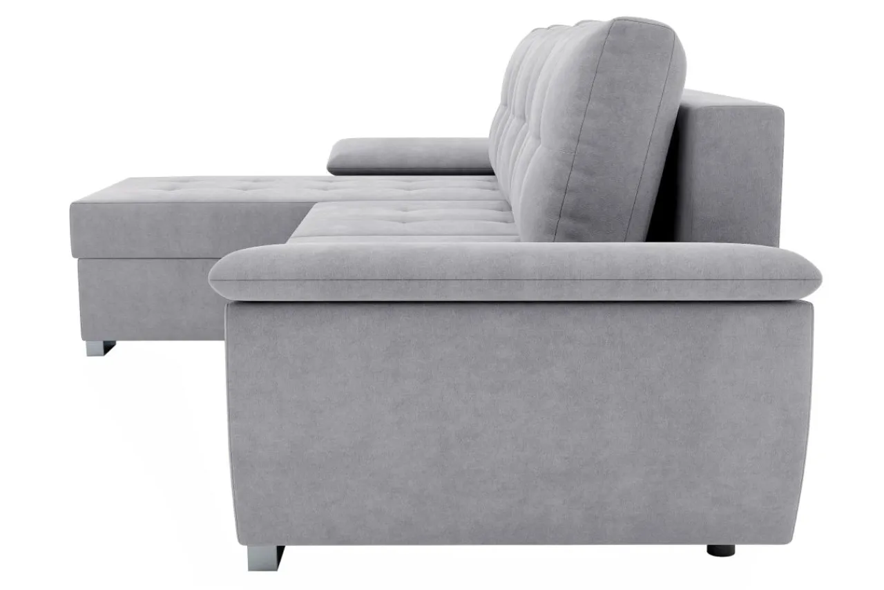 - Narożnik pokryto szarym welurem w srebrnym odcieniu. Możesz głaskać miękką w dotyku tkaninę
