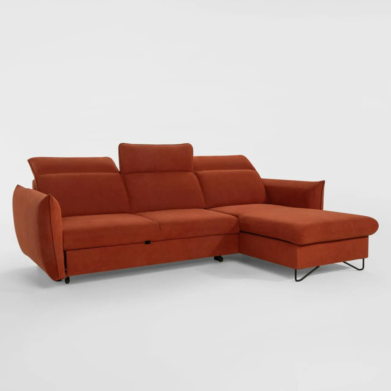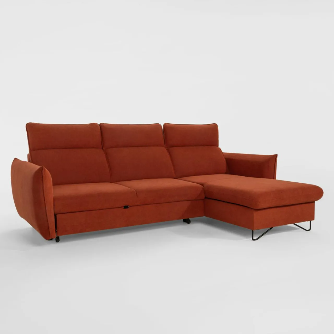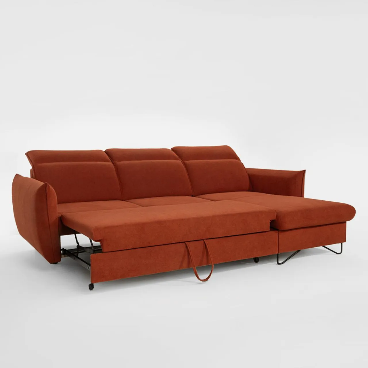 Stelaż pod siedziskiem wysuwamy i podnosimy za pomocą uchwytu. Mebel nie wymaga odsuwania od ściany. Idealny do okazjonalnego spania.
