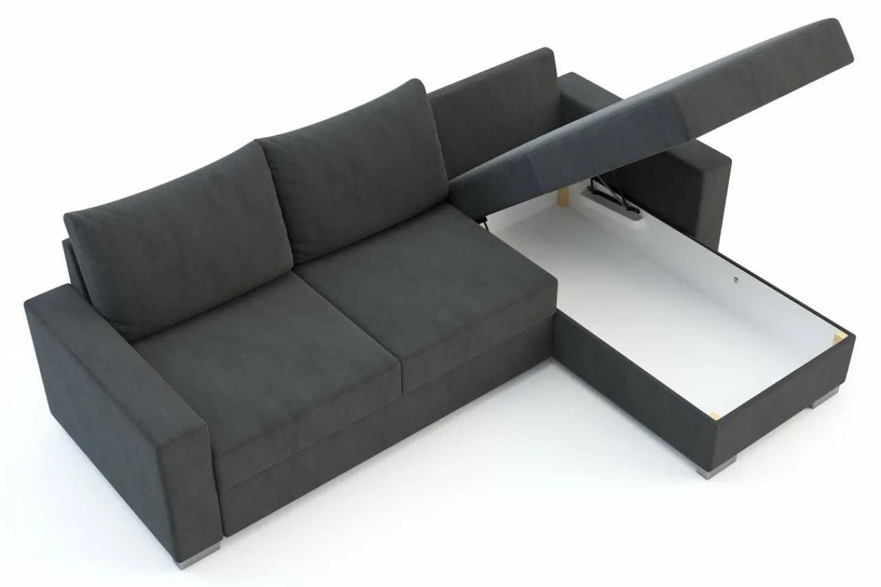 - Narożnik posiada wygodny system rozkładania typu delfin: wysuń siedzisko, pociągnij za specjalny uchwyt i szybko powiększ powierzchnię spania.