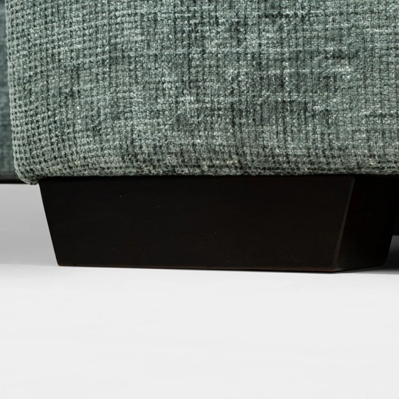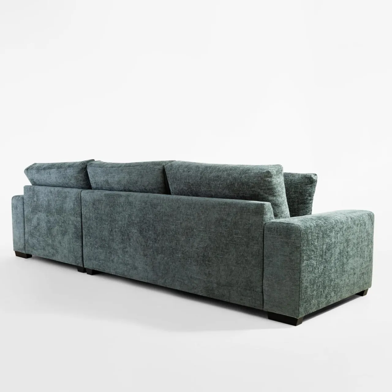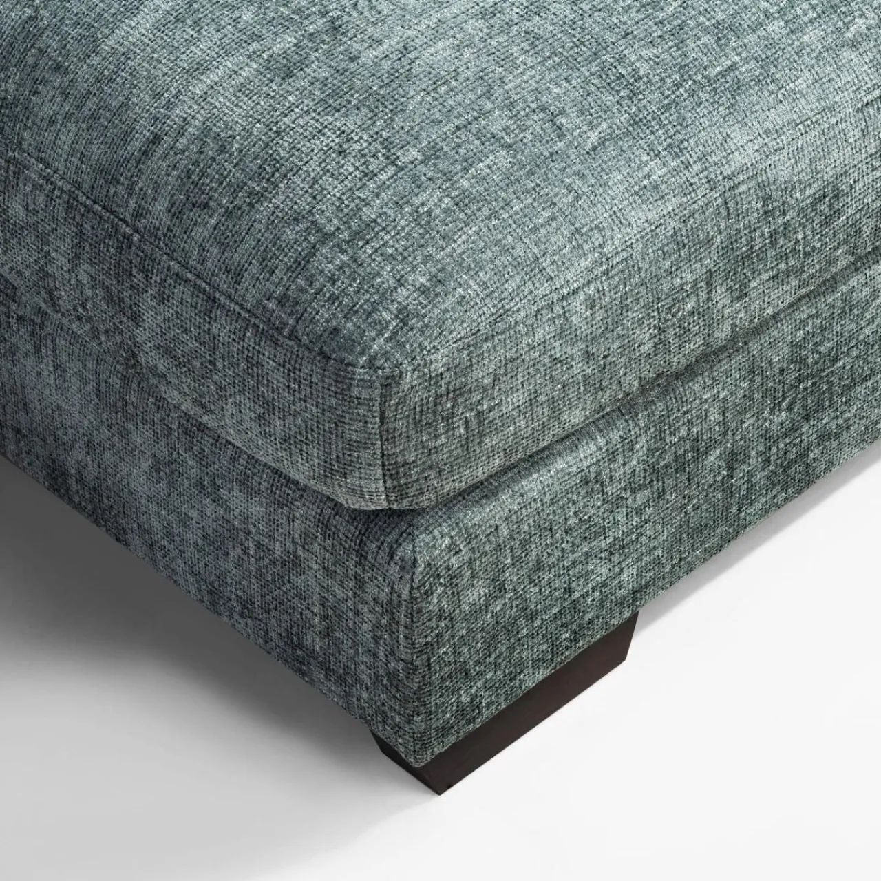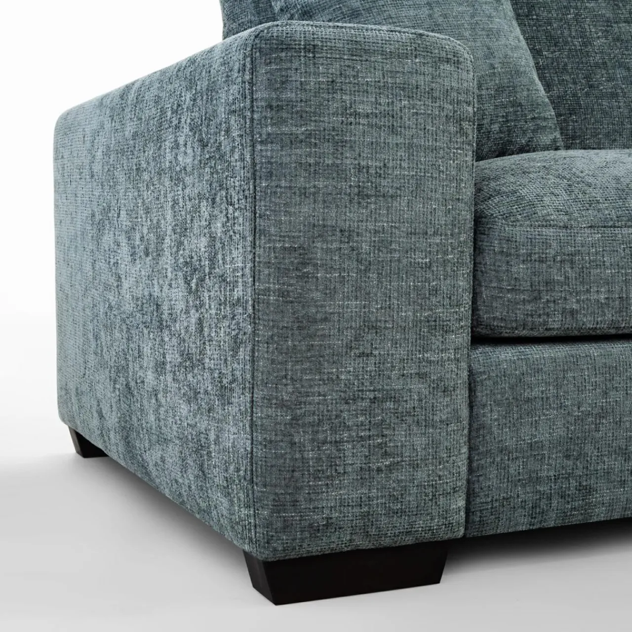 Narożnik pokryto miękkim szenilem MAJESTIC. Tkanina ma lekko wyczuwalną pod palcami strukturę, a nici lekko połyskują i różnią się odcieniem szarości, stąd wrażenie cieniowania i trójwymiarowości.