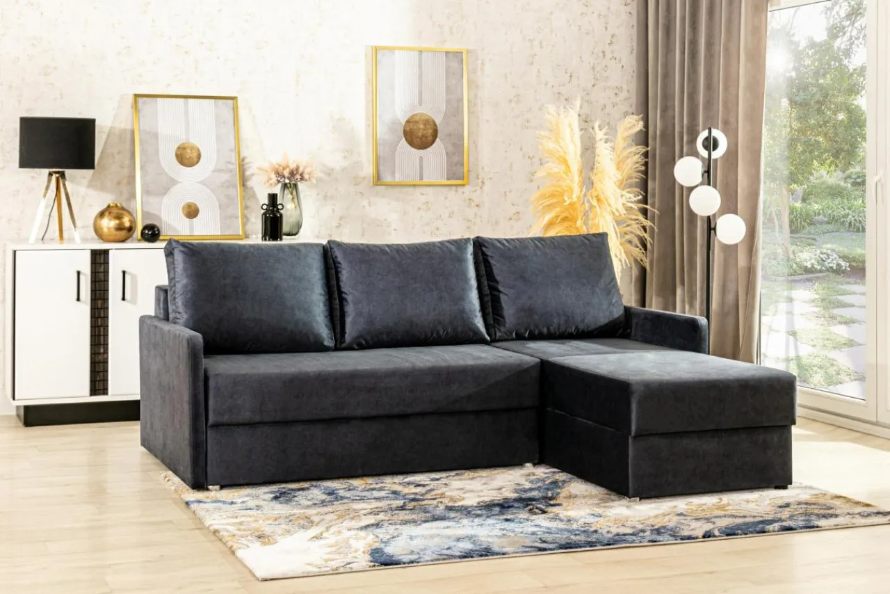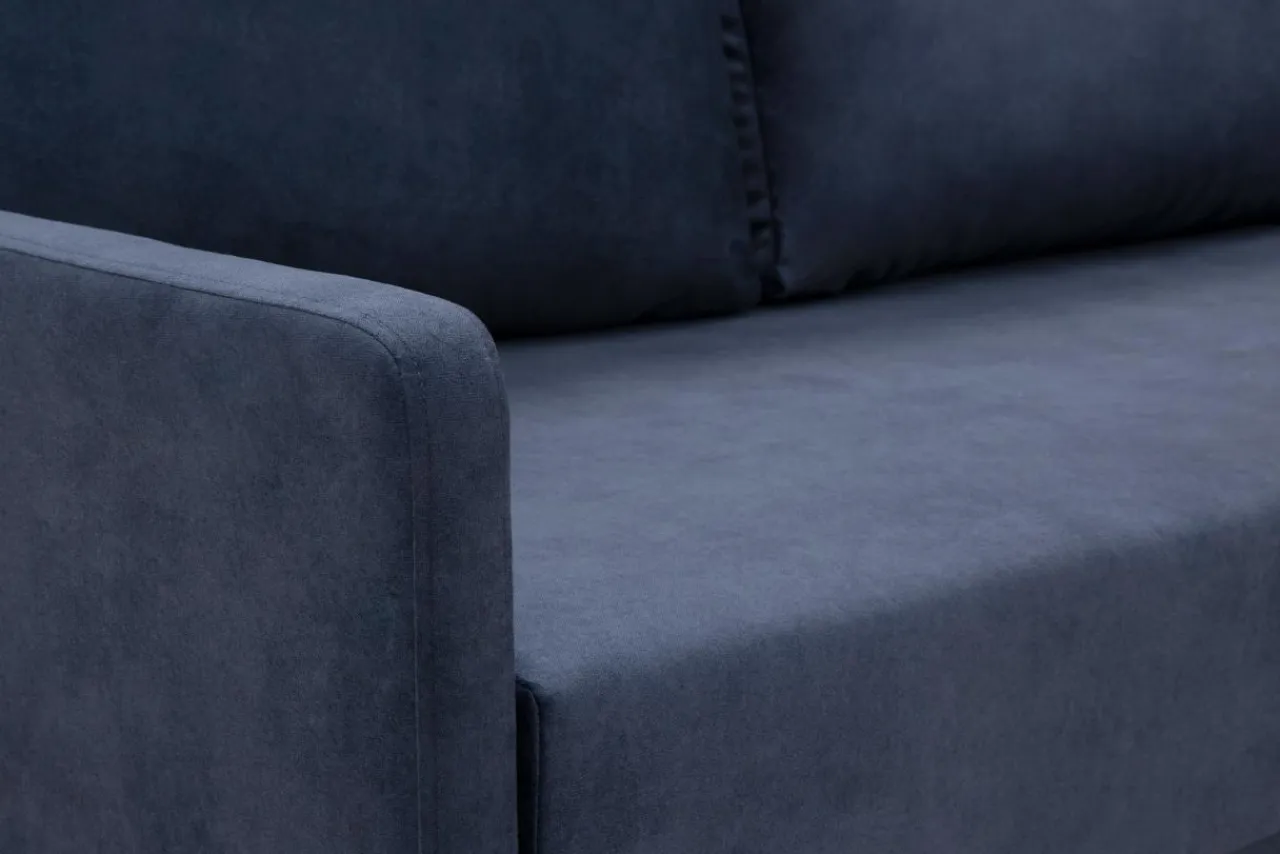 Tkanina ZETTA, którą obity jest narożnik, posiada chmurny, niebieski odcień, a dzięki delikatnemu meszkowi jest bardzo przyjemna w dotyku. Granatowy narożnik możesz połączyć z kontrastowymi kolorami, np. żółtym lub pomarańczowym. Dzięki temu pomieszczenie nabierze wyrazu i energii.