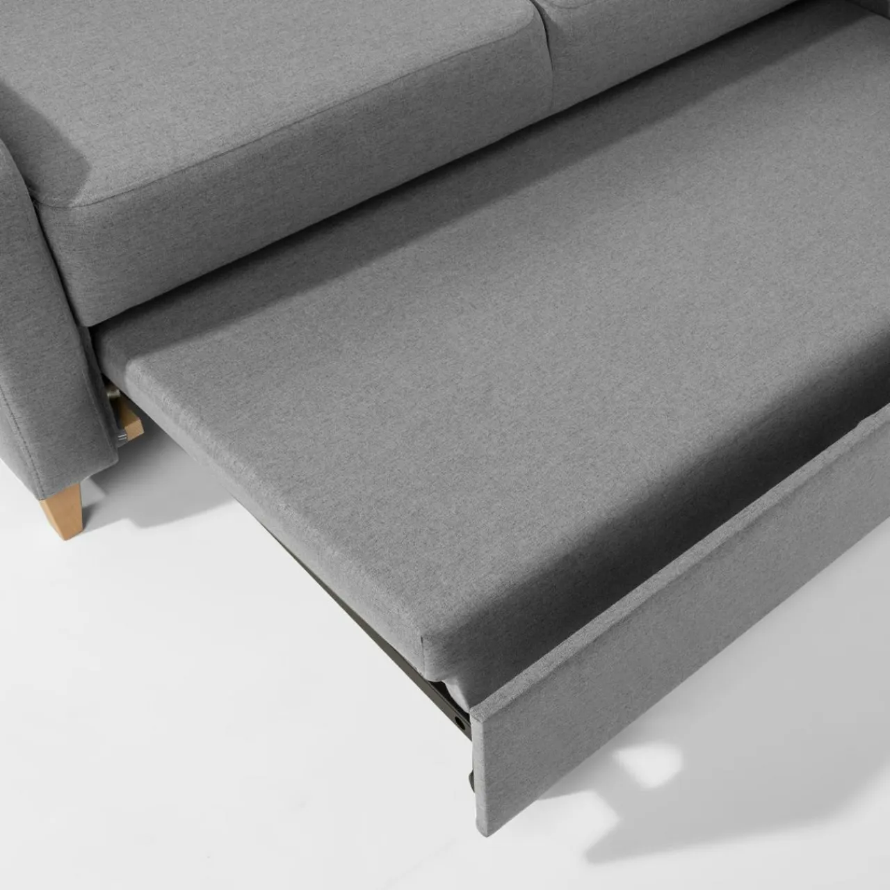 Stelaż pod siedziskiem wysuwamy i podnosimy za pomocą uchwytu. Mebel nie wymaga odsuwania od ściany. Idealny do okazjonalnego spania.