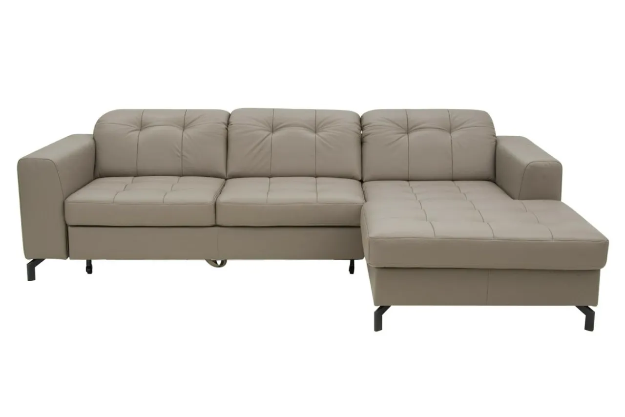 - Narożnik obity jest mixem skór (naturalna i ekologiczna) w kolorze beżowym (z odcieniem brązu i szarości).