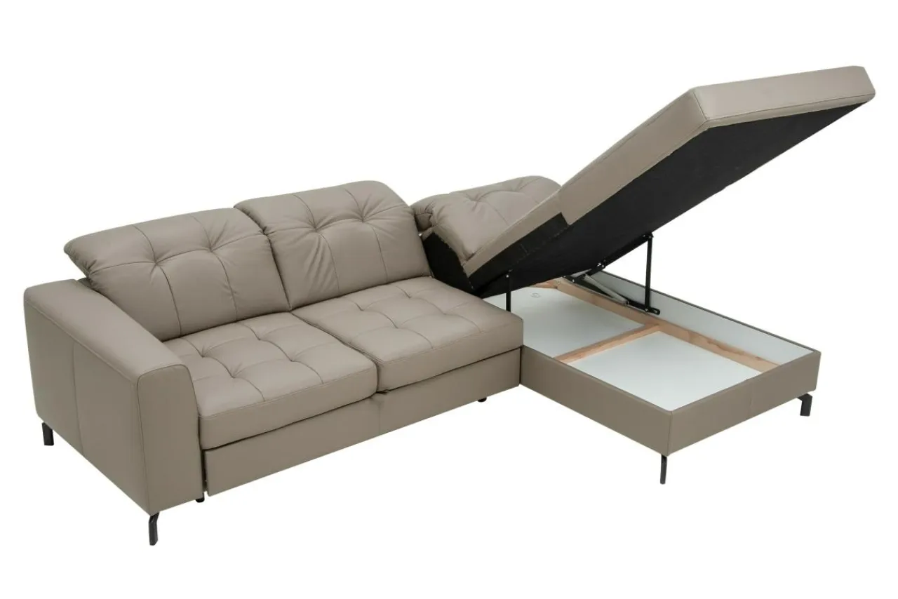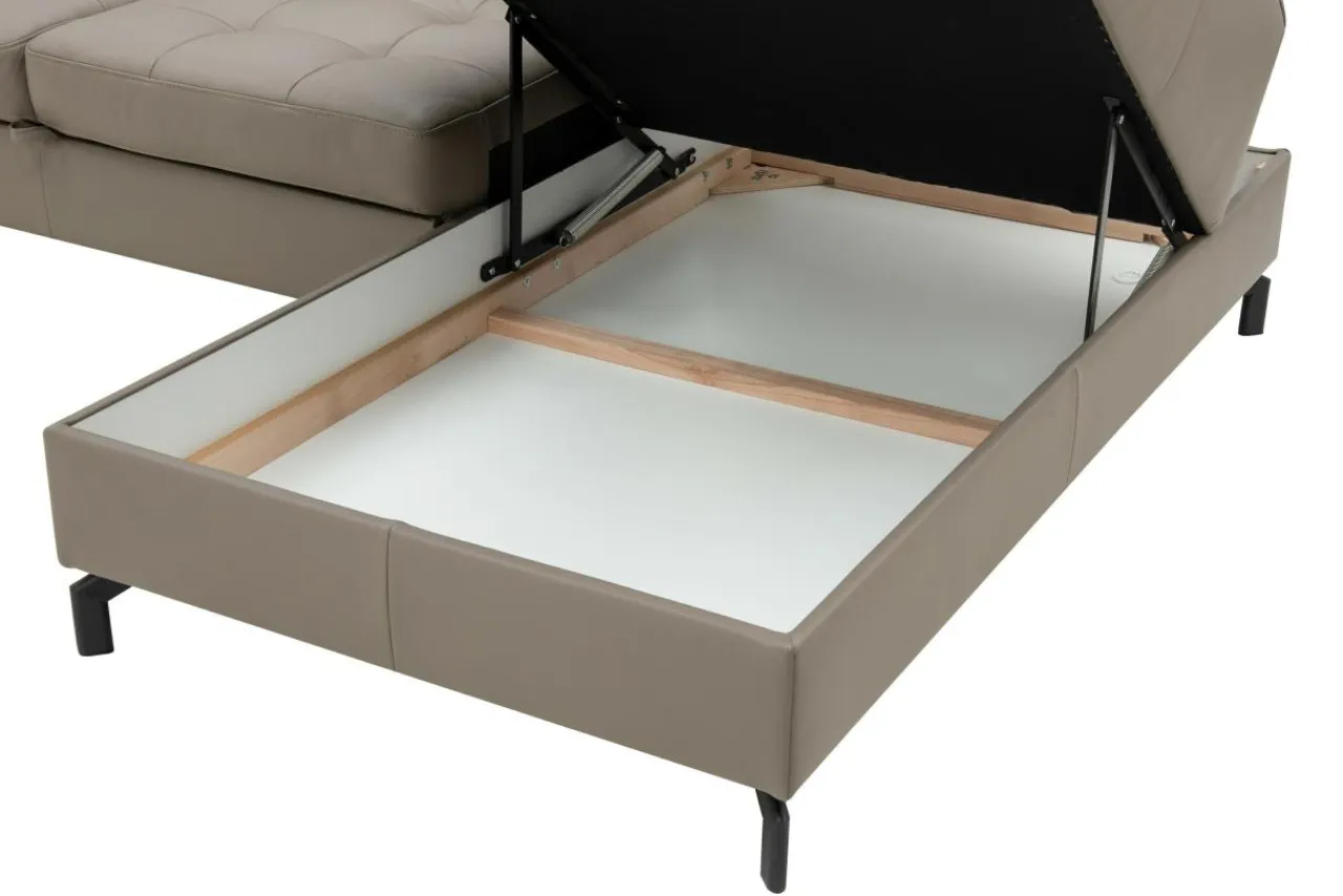 Narożnik posiada wbudowany pojemnik. Możesz wykorzystać go do przechowywania pościeli, koców lub innych tekstyliów. Pojemnik znajduje się w otomanie.