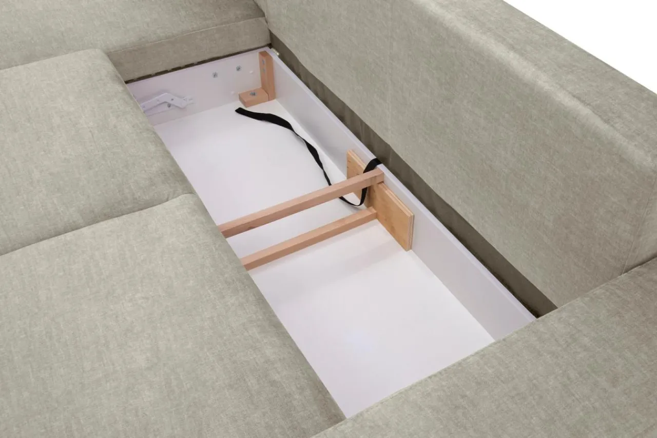 - W środku siedziska znajduje się pojemnik na pościel, do którego możesz schować poduszkę i kołdrę.