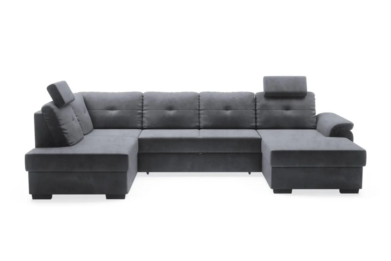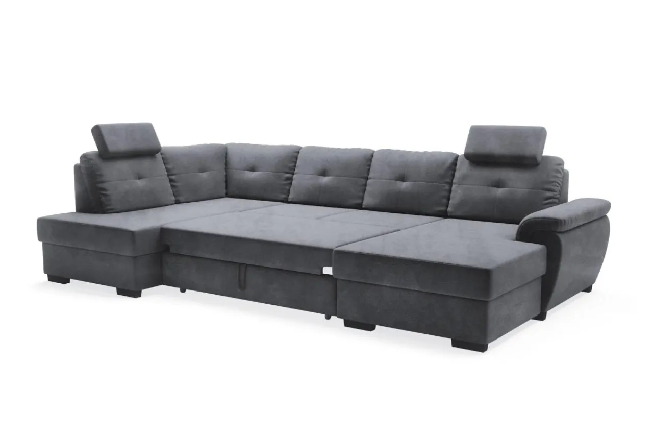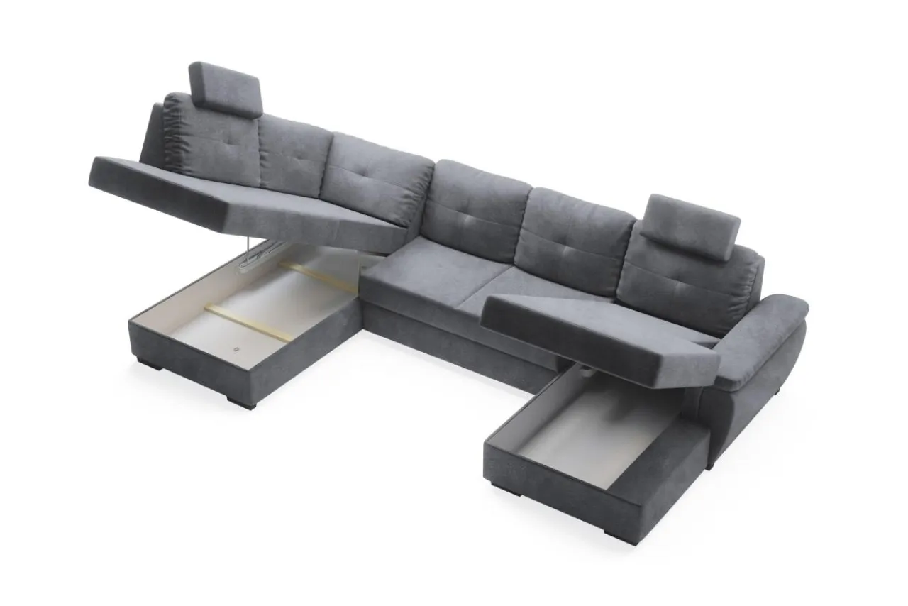 Schowki znajdują się w otomanach narożnika. Po uniesieniu do góry wierzchniej części można szybko i bez zbędnego wysiłku wyciągnąć pościel.