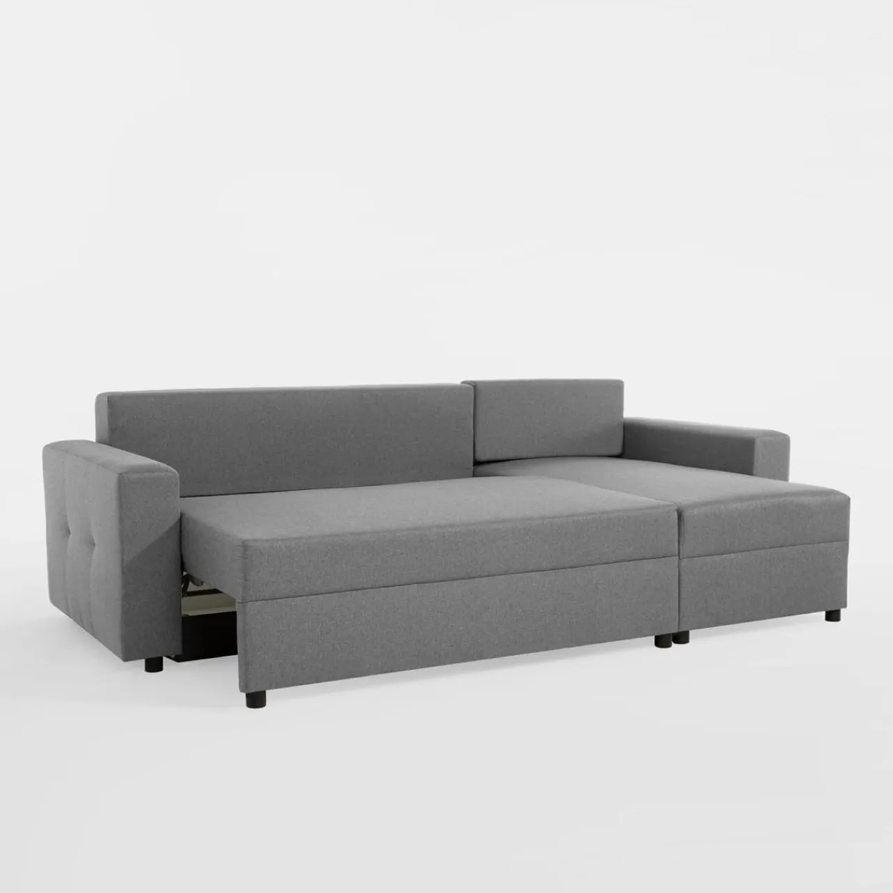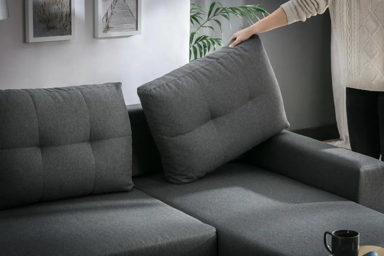 - W narożniku pod siedziskiem znajduje się pojemnik na pościel, który przyda się na przechowanie pościeli i poduszek.