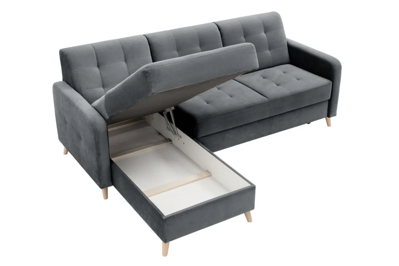 Dzięki zastosowaniu funkcji „delfin”, narożnik VOLARE można łatwo rozłożyć. Wystarczy podnieść i wysunąć stelaż znajdujący się pod siedziskiem.