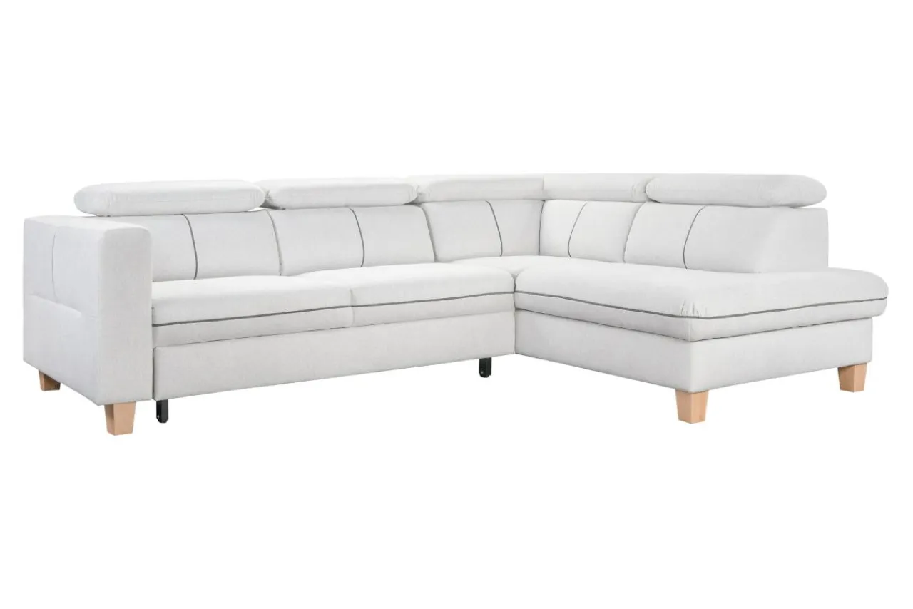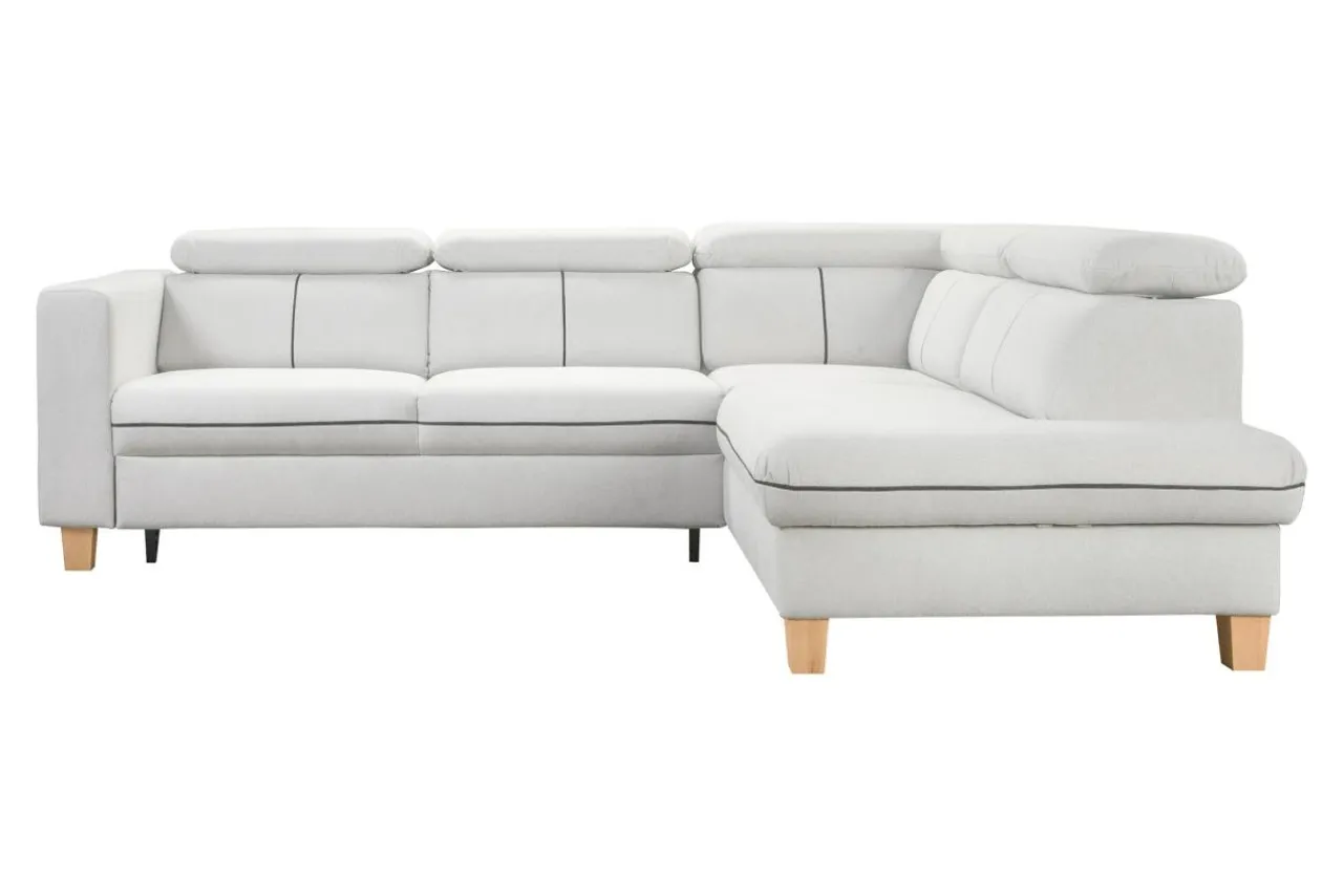 Do obicia narożnika wykorzystano tkaninę POLARIS. Tkanina jest odporna na mechacenie i ścieranie. Jej cechą charakterystyczną jest wyraźny splot nitek, który tworzy interesujący efekt wizualny. Kremowy narożnik posiada wyraziste, szare przeszycia, ładnie komponujące się z drewnianymi nóżkami.