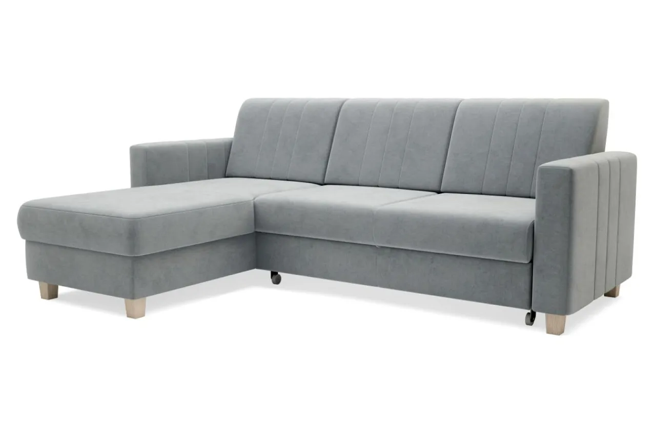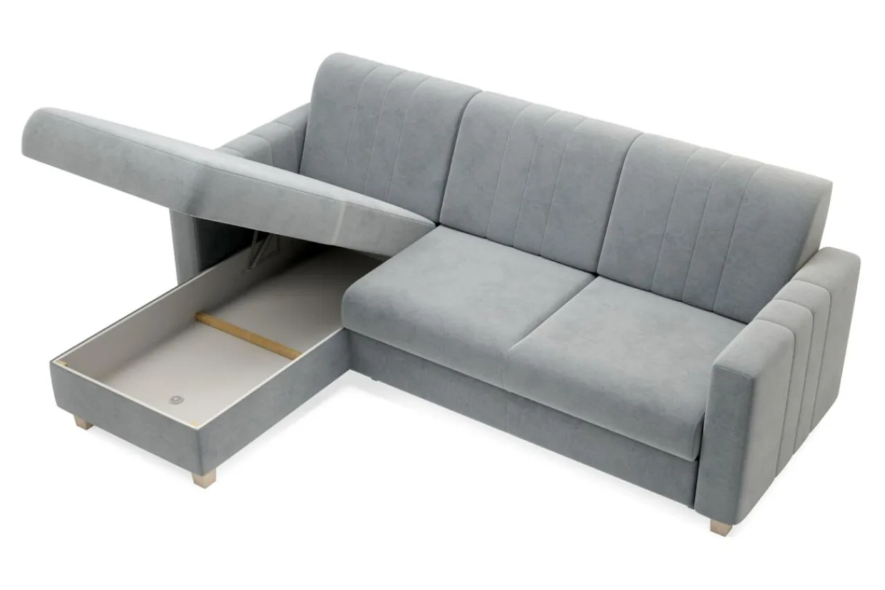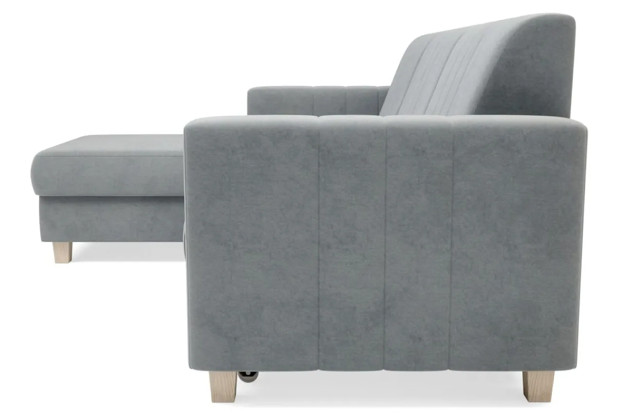 Dzięki szarej kolorystyce i drewnianym nóżkom narożnik możesz wkomponować w nowoczesne wnętrza, wypełnione chłodnymi barwami.