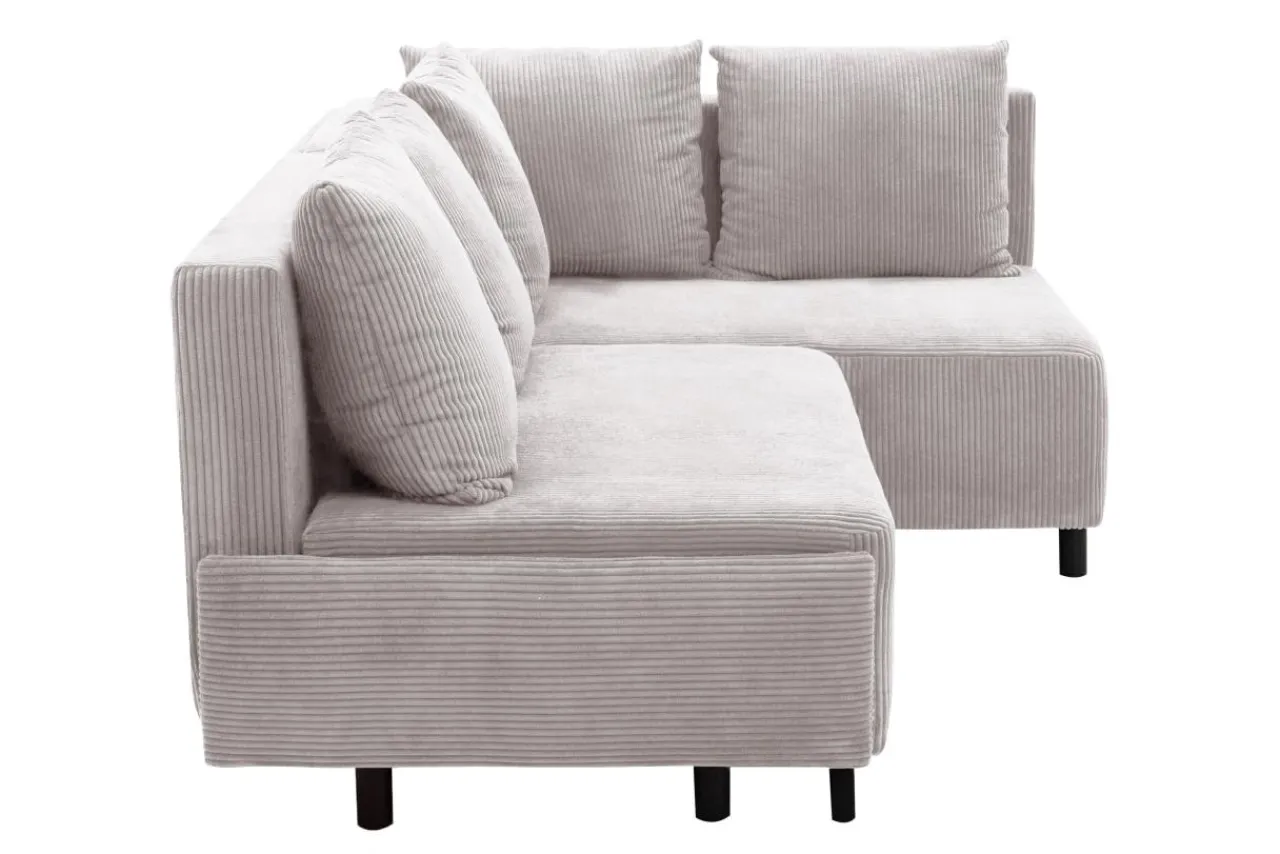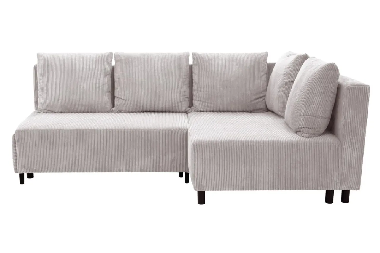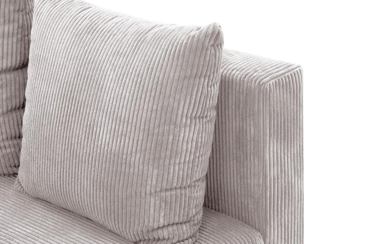 Narożnik w jasnoszarym kolorze przyciąga wzrok miękką, sztruksową tapicerką.