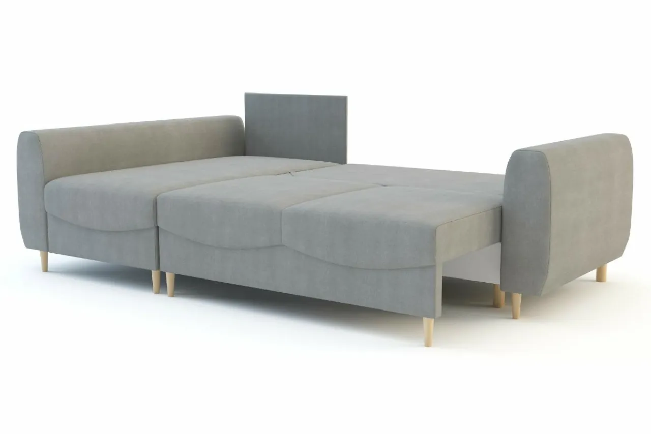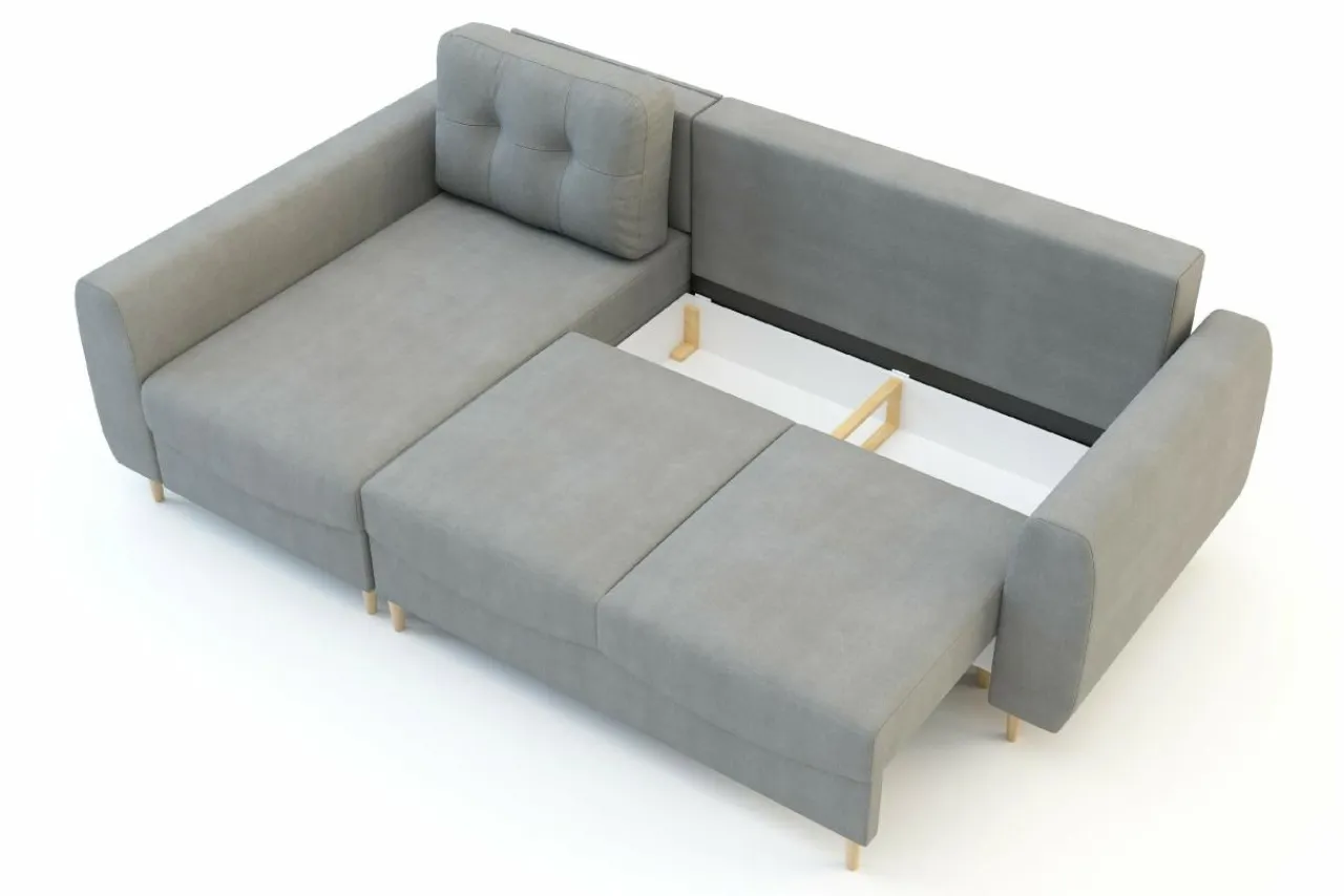 Aby przenocować gościa, wystarczy wysunąć siedzisko i złożyć oparcie. Z pojemnika, znajdującego się pod siedziskiem możesz korzystać w trakcie rozkładania narożnika.