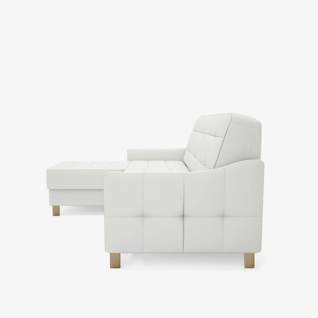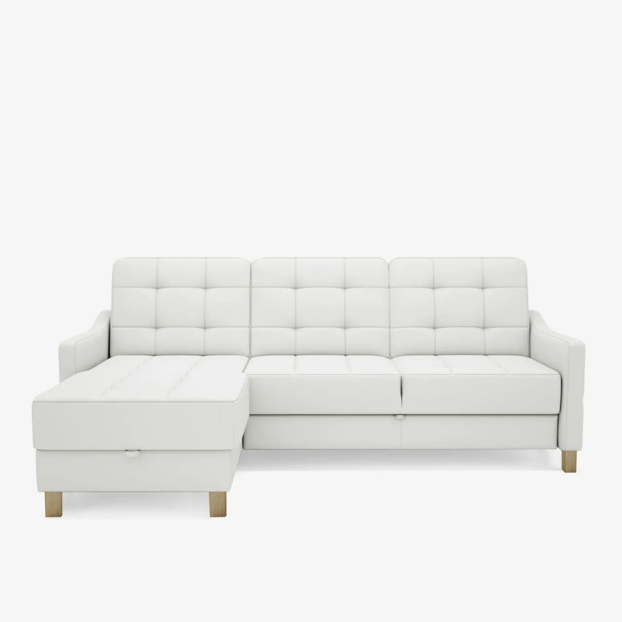 Komfortowy narożnik Malmo wykonany w całości ze skóry naturalnej to propozycja do salonu. Biały kolor rozjaśni optycznie pomieszczenie. Skóra naturalna podnosi prestiż, jest też bardziej elastyczna aniżeli tkaniny dzięki czemu bryła nabiera bardziej eleganckich kształtów. Model wyróżnia się ciekawym pikowaniem niemal na całym narożniku, siedzisku boku i oparciu narożnika. Wysokie oparcie ułatwia znalezienie właściwego podparcia pod głowę. Za komfort siedzenia odpowiadają sprężyny faliste z dodatkiem pianek. Jeśli zajdzie potrzeba przyjęcia gości na noc nie będzie z tym problemu gdyż jest wyposażony w funkcję spania i pojemnik na pościel. Nóżki drewniane w kolorze buk naturalny idealnie komponują się z jasnym kolorem tapicerki. Niewątpliwą zaletą jest uniwersalność do pierwszego montażu narożnika dzięki czemu właściwą stronę można zmontować już w domu.