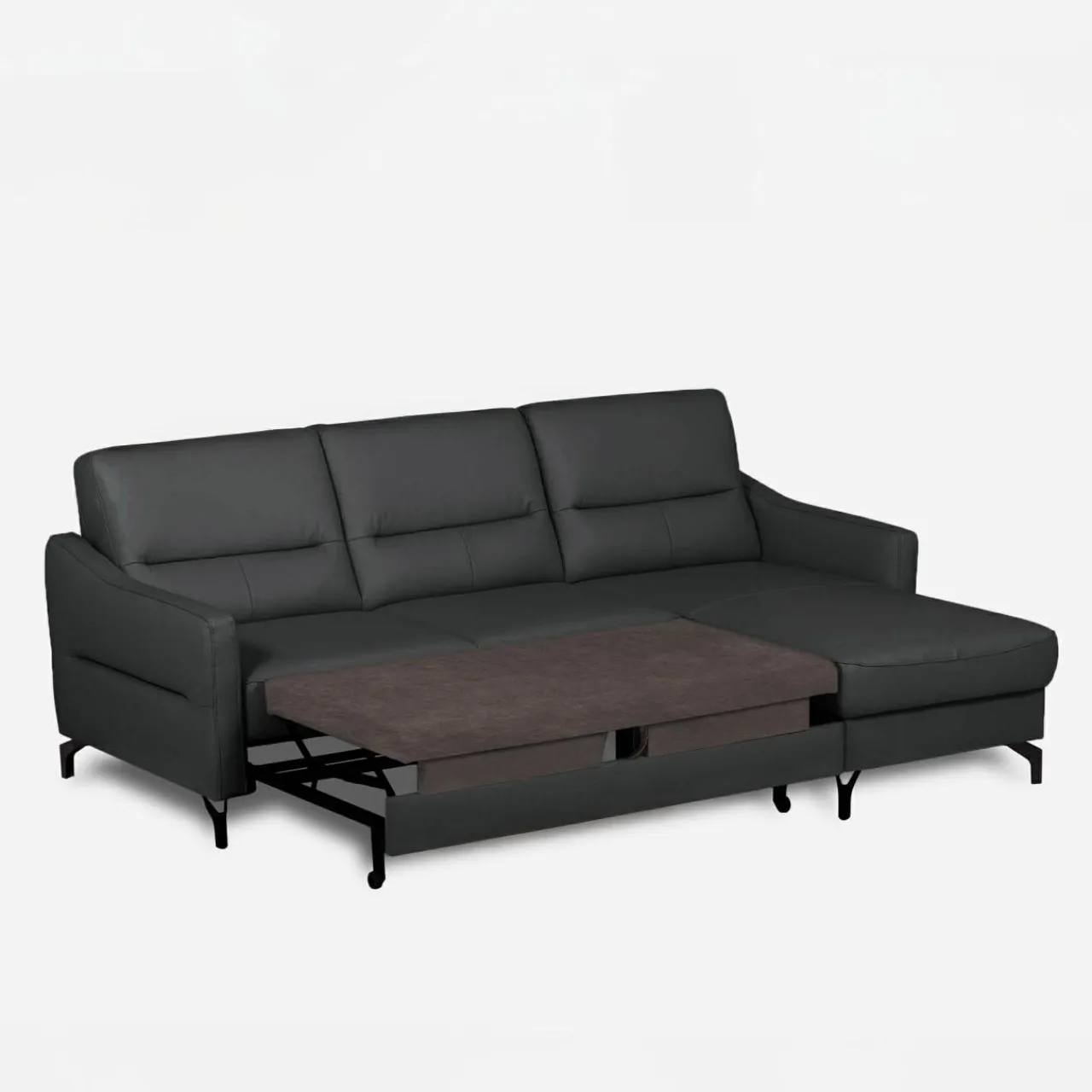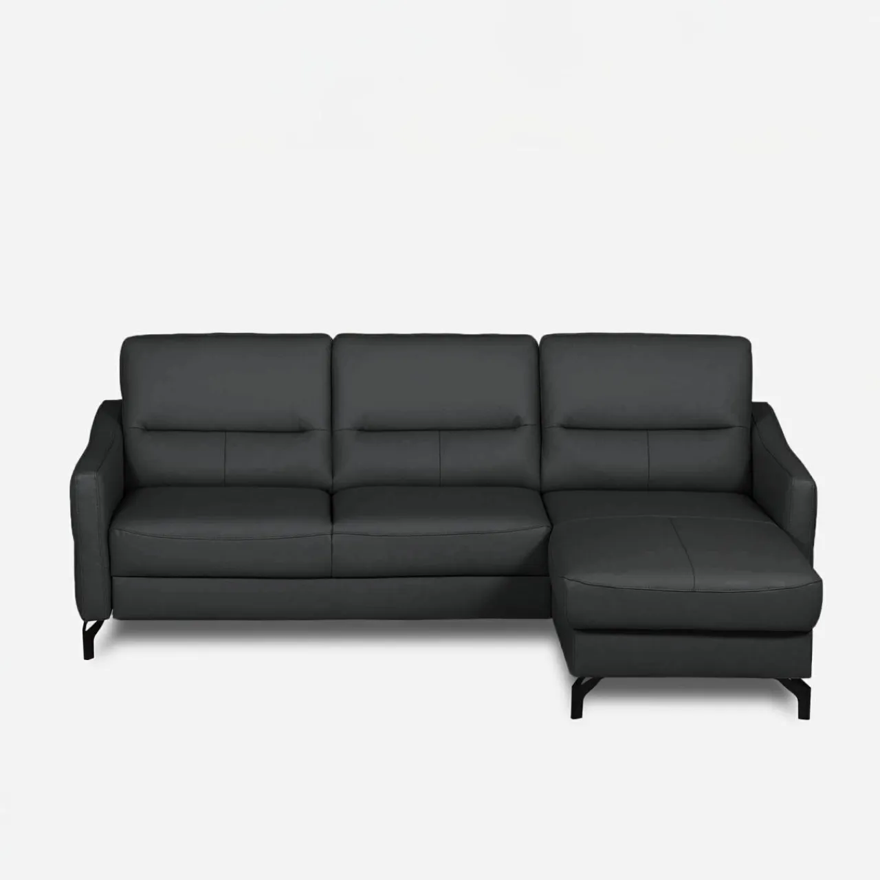 - Narożnik obity jest mixem skór (naturalna i ekologiczna) w kolorze grafitowym.