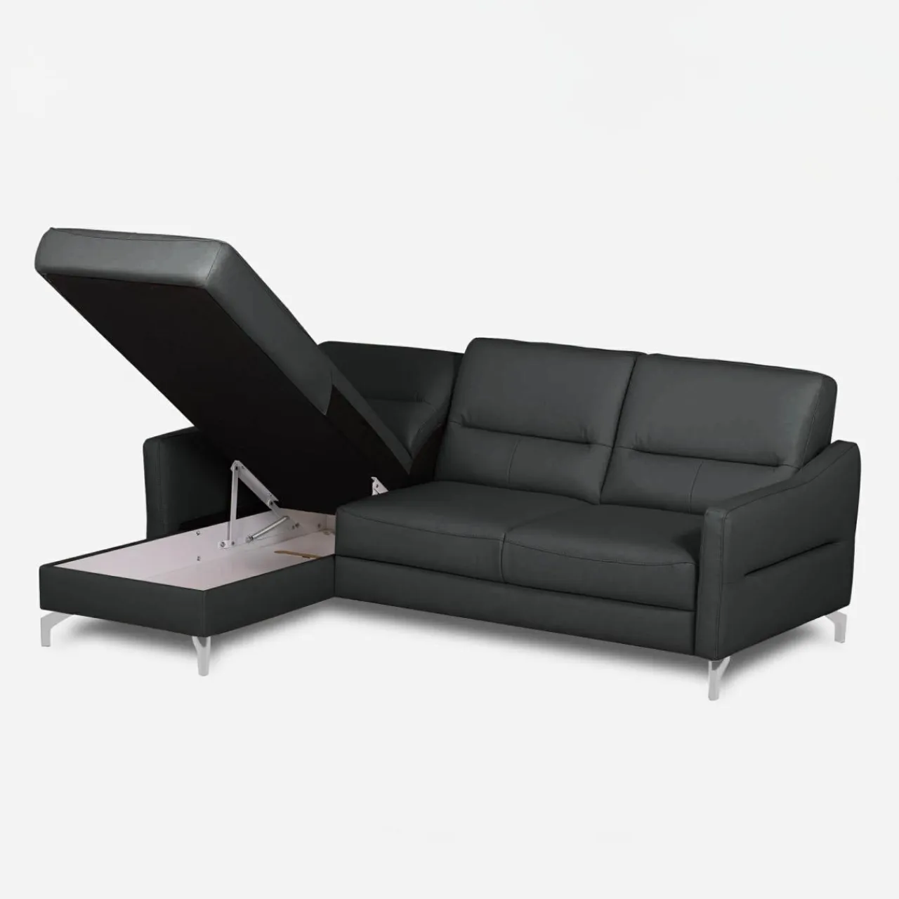 - Chromowane nóżki – podkreślają elegancki, współczesny charakter narożnika i dodają mu blasku, stając się stylowym elementem wnętrza.