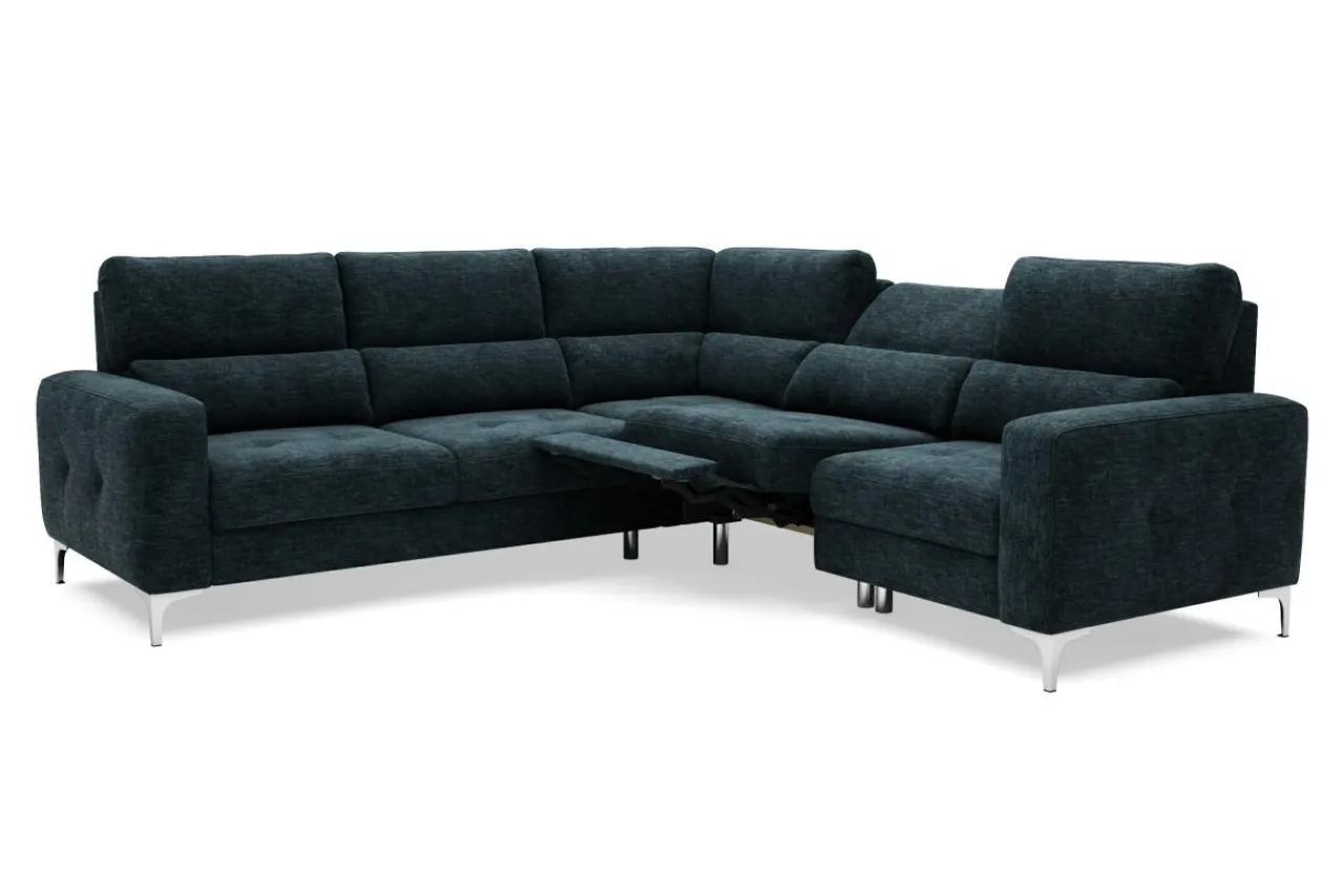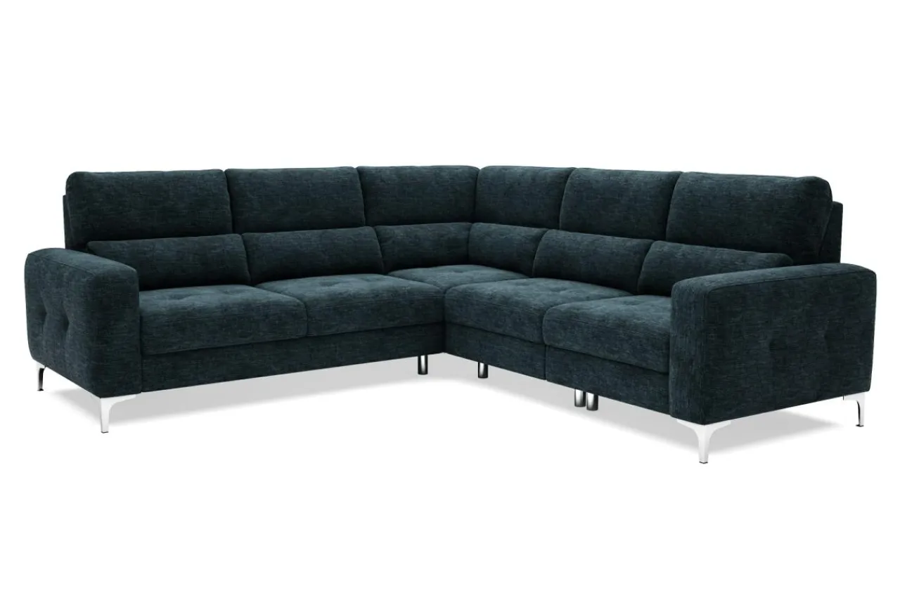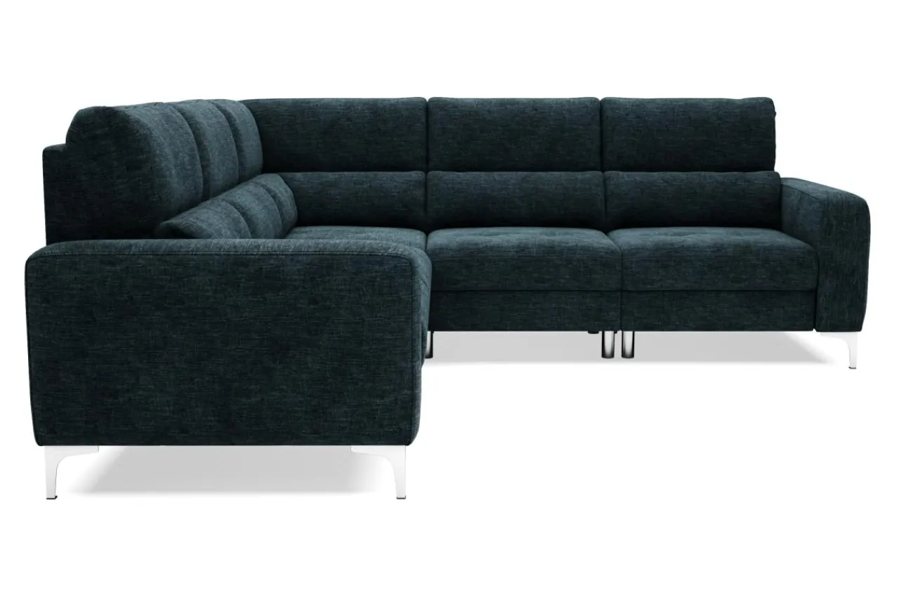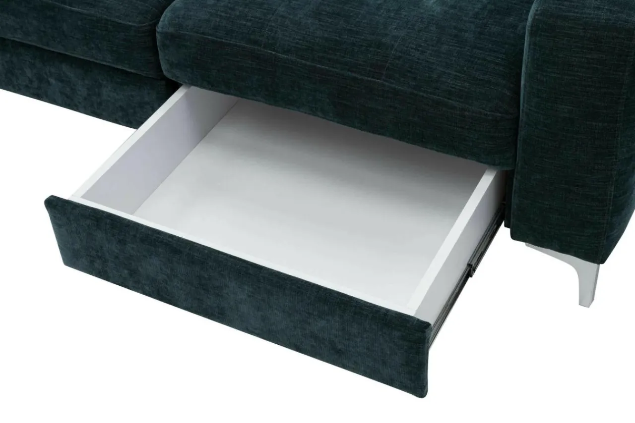 Dzięki zastosowaniu mechanizmu typu delfin, możesz przekształcić narożnik w łóżko do okazjonalnego spania, bez konieczności odsuwania go od ściany. Poszewki i koce możesz schować do szuflady, znajdującej się pod jednym z foteli.