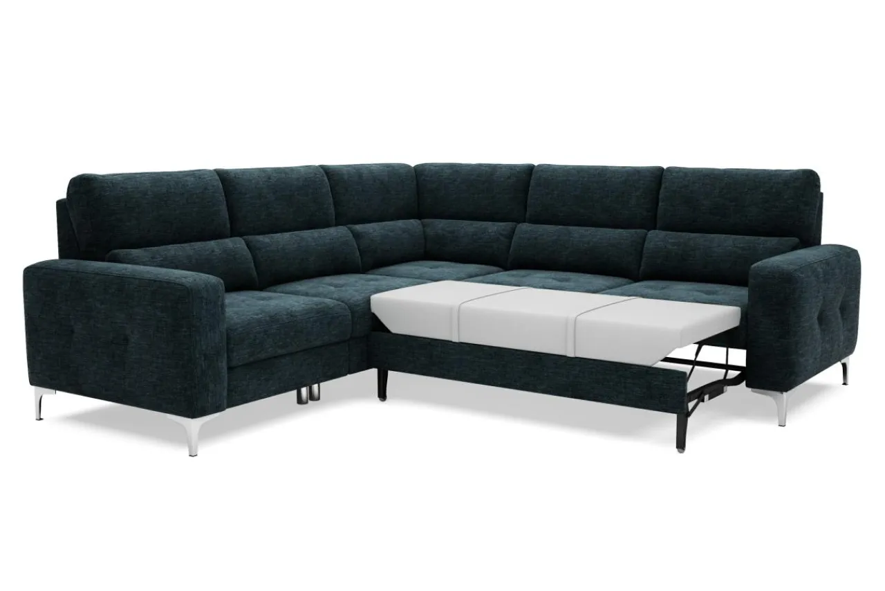 Dzięki zastosowaniu mechanizmu typu delfin możesz przekształcić narożnik w łóżko do okazjonalnego spania, bez konieczności odsuwania go od ściany.