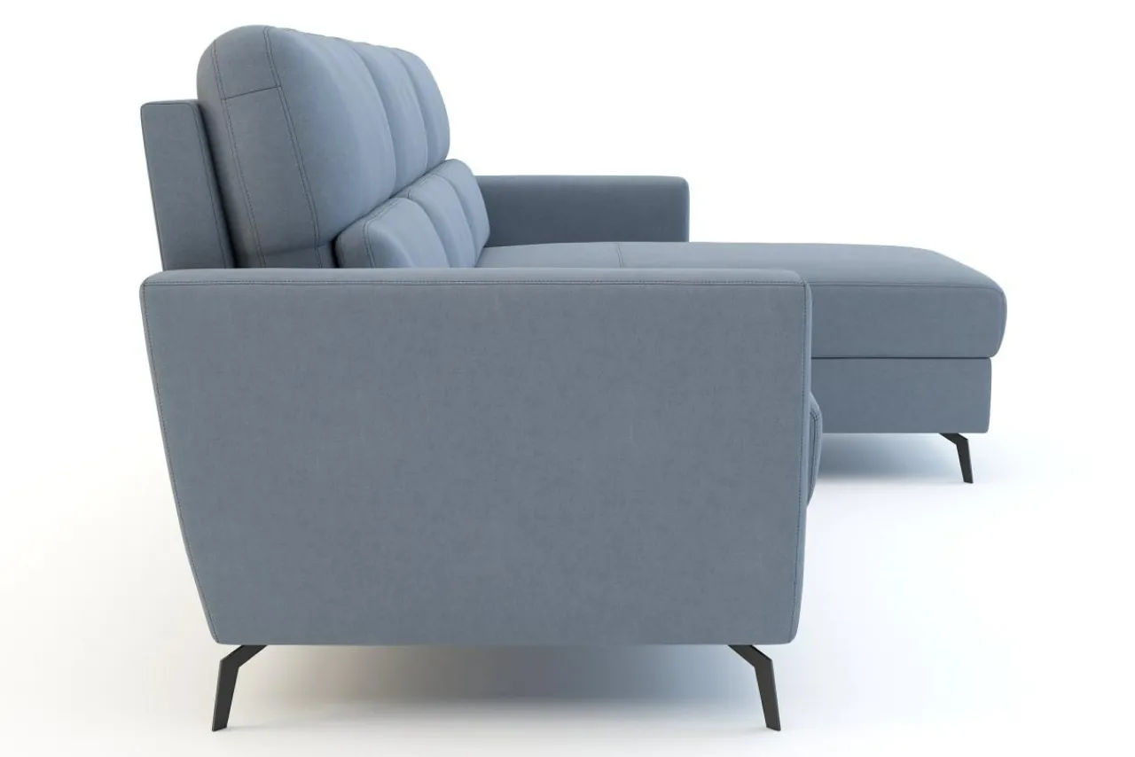 Narożnik osadzony jest na ukośnych metalowych nóżkach. Obity jest szaroniebieską tkaniną, która z daleka wygląda jak skóra. Jest przyjemna w dotyku, w niejednolitej barwie.
