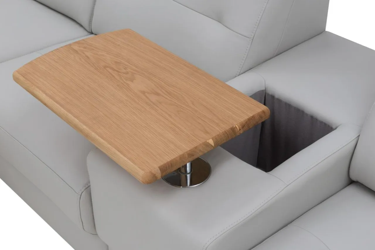 - Otwierany i obrotowy blat sprawdzi się też jako miejsce na filiżankę lub przekąski. W schowku możesz przechować niewielkie akcesoria czy piloty.