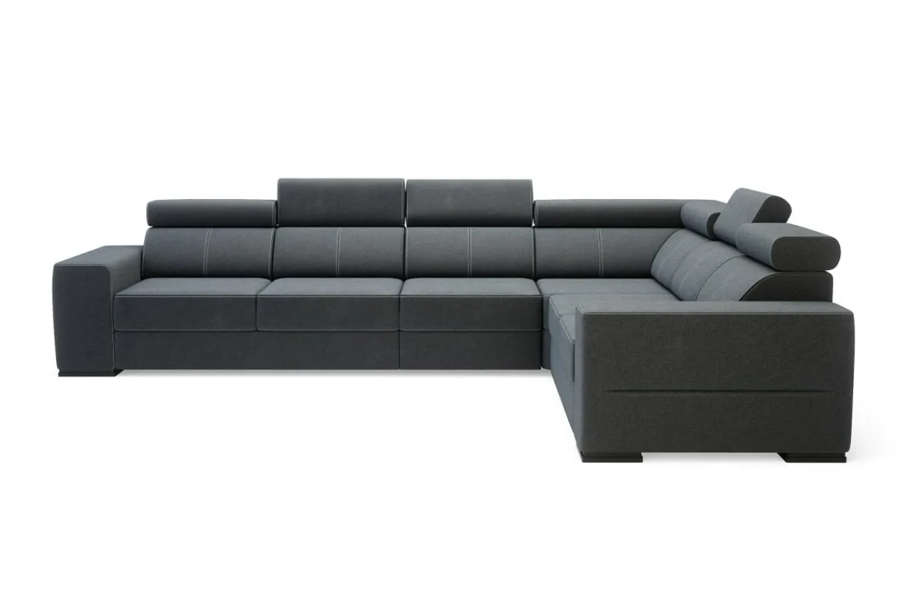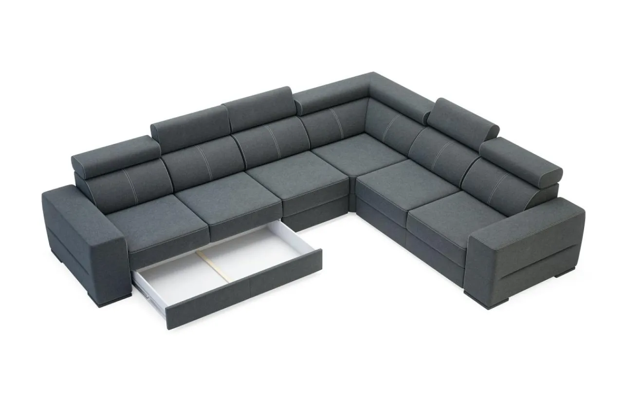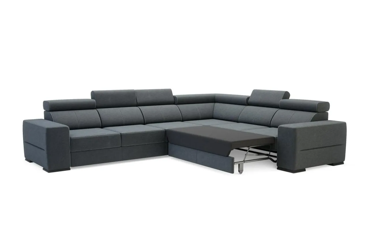 Narożnik APOLLO został wyposażony w funkcję delfin, dzięki której wystarczy podnieść i wysunąć stelaż znajdujący się pod siedziskiem, by uzyskać powierzchnię w pełni przygotowaną do nocnego wypoczynku.