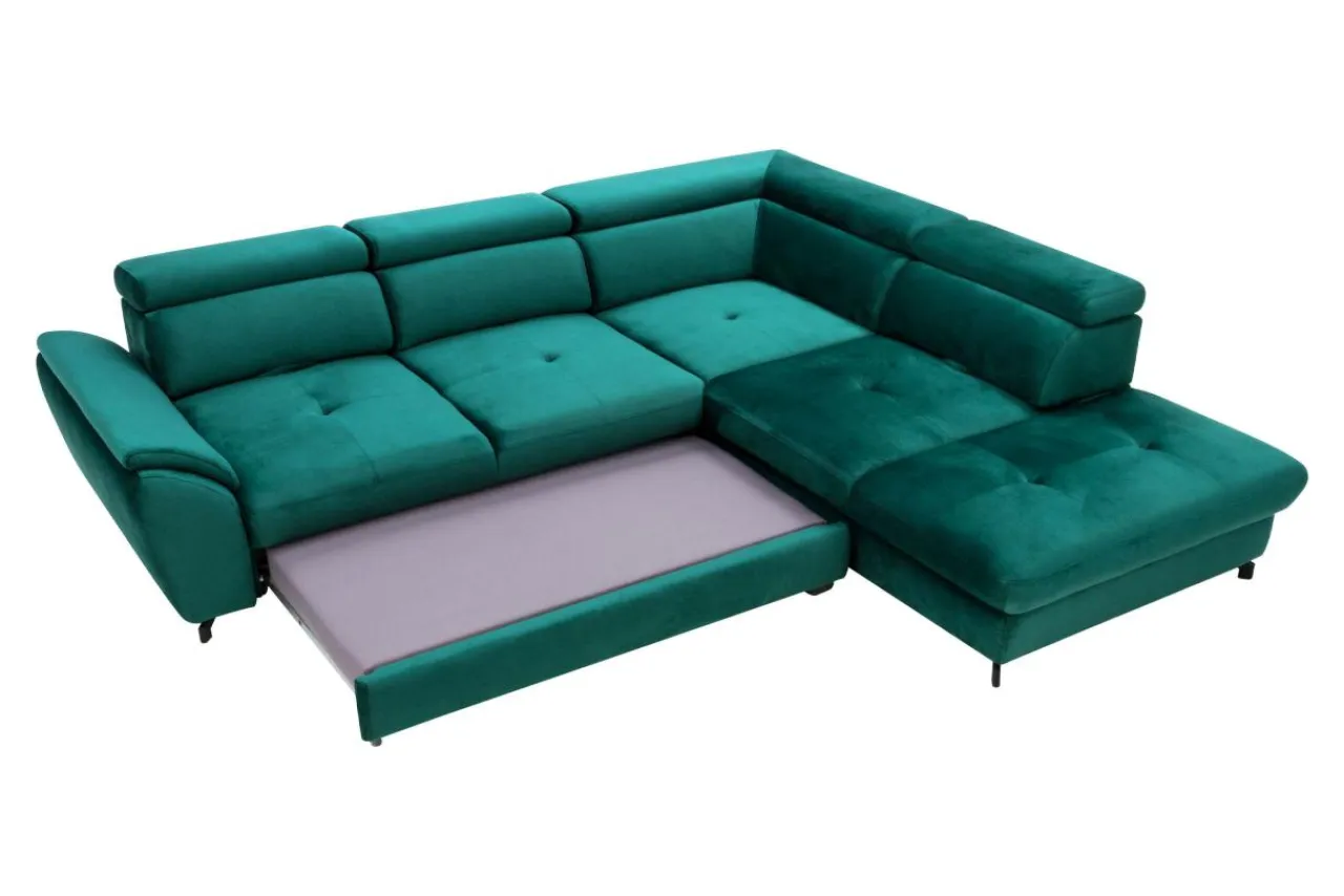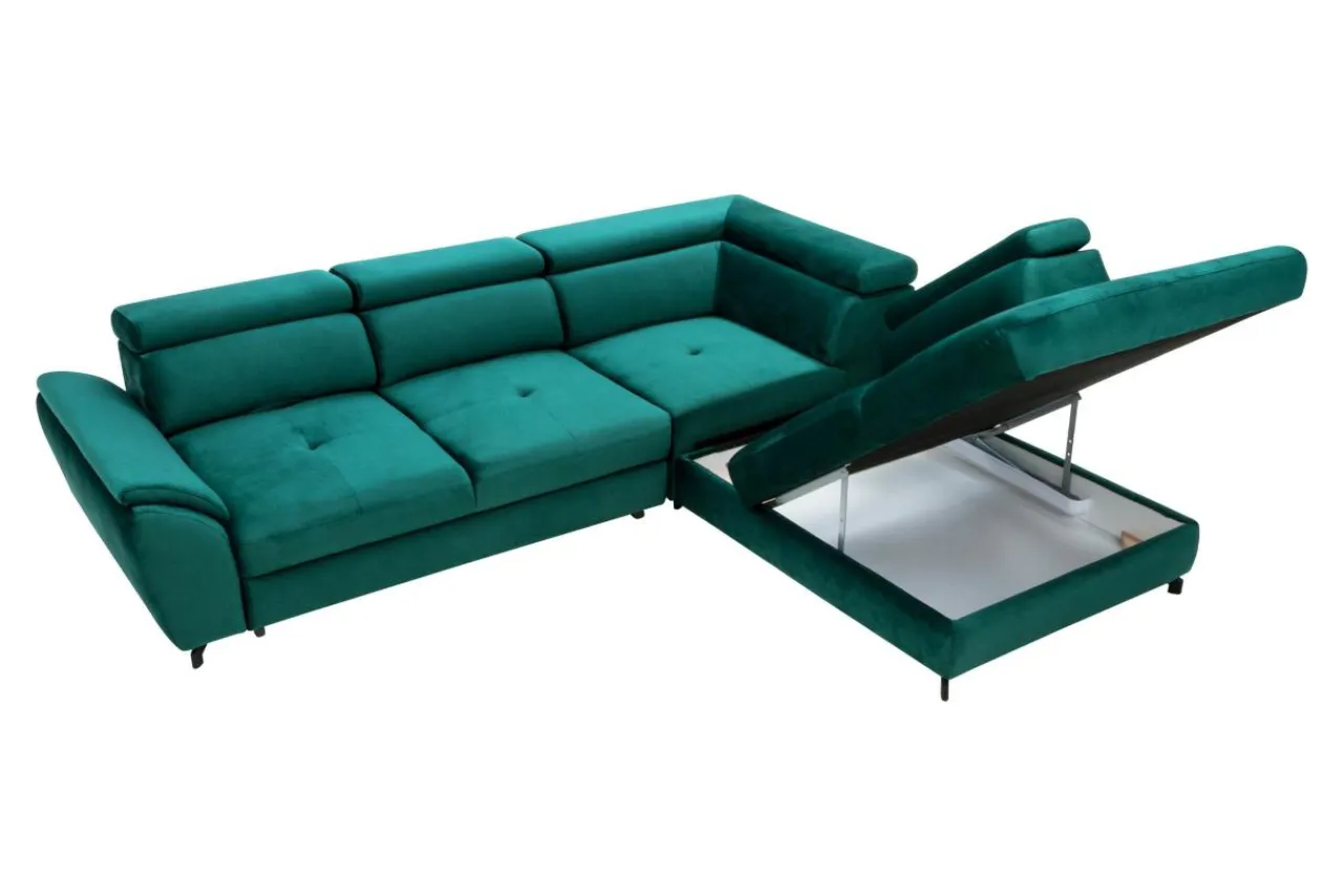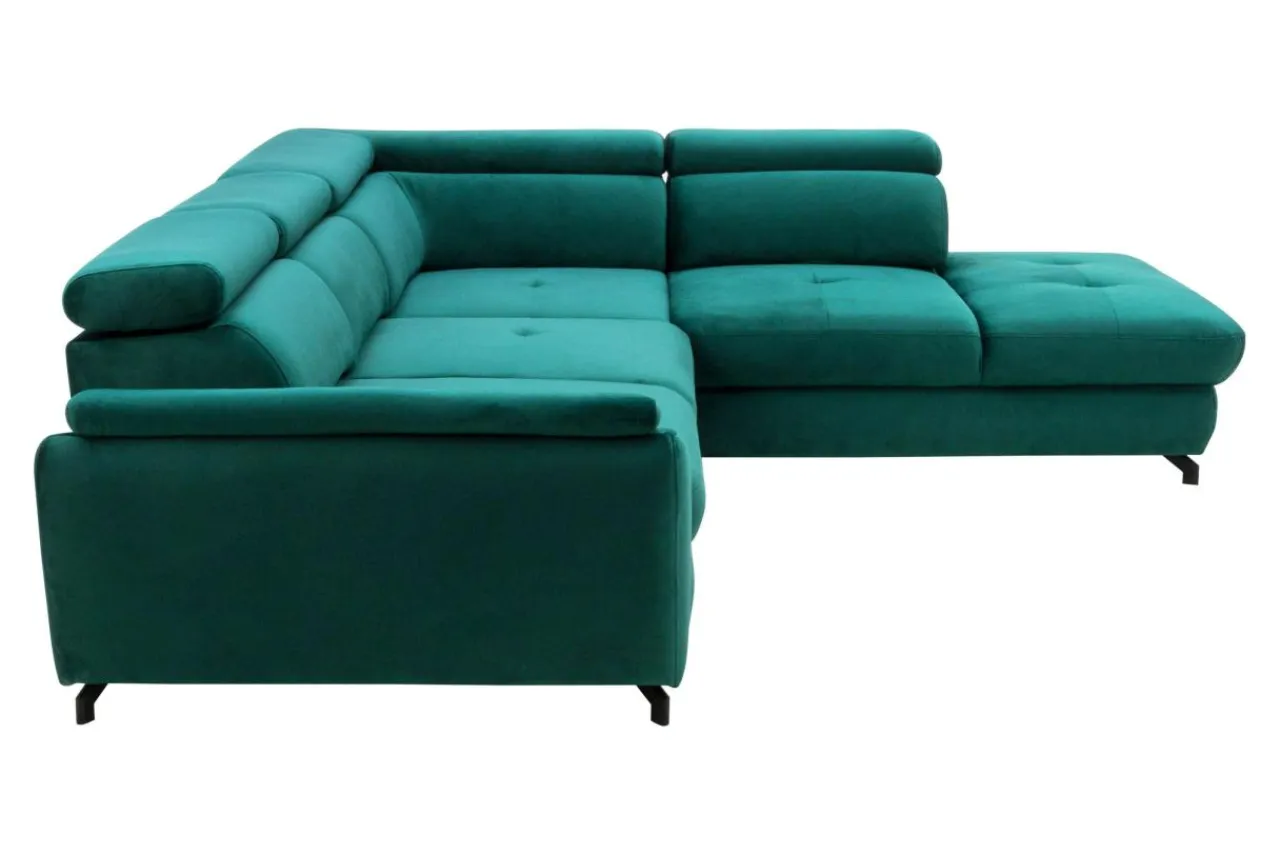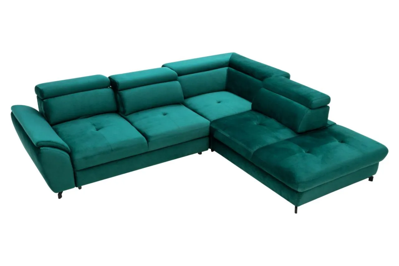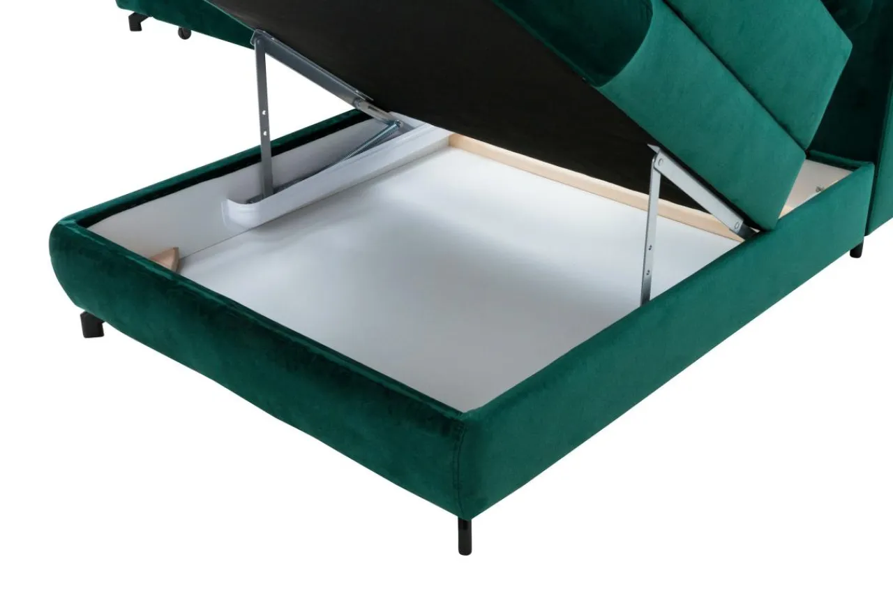 Narożnik ustawiono na eleganckich nóżkach wykonanych z metalu i malowanych na czarno. Świetnie wyglądają na tle szmaragdowego koloru tkaniny. Tkanina MONOLITH to ma wysoki współczynnik odporności na ścieranie, pokryta jest hyrdrofobową powłoką WATER REPELLENT. Zabezpiecza ona tkaninę przed natychmiastowym wsiąkaniem rozlanych płynów do jej wnętrza dając nam więcej czasu na odsączenie plamy.